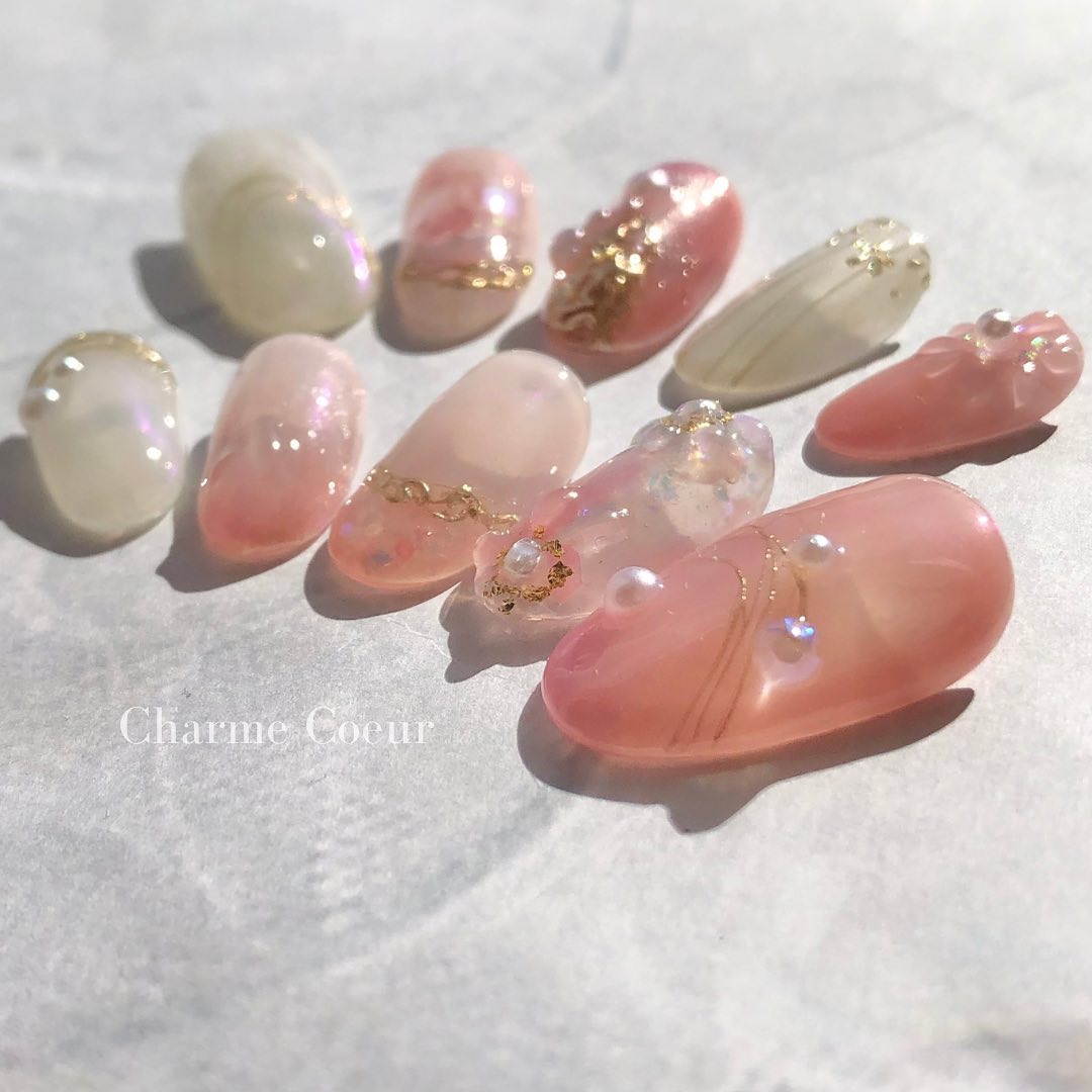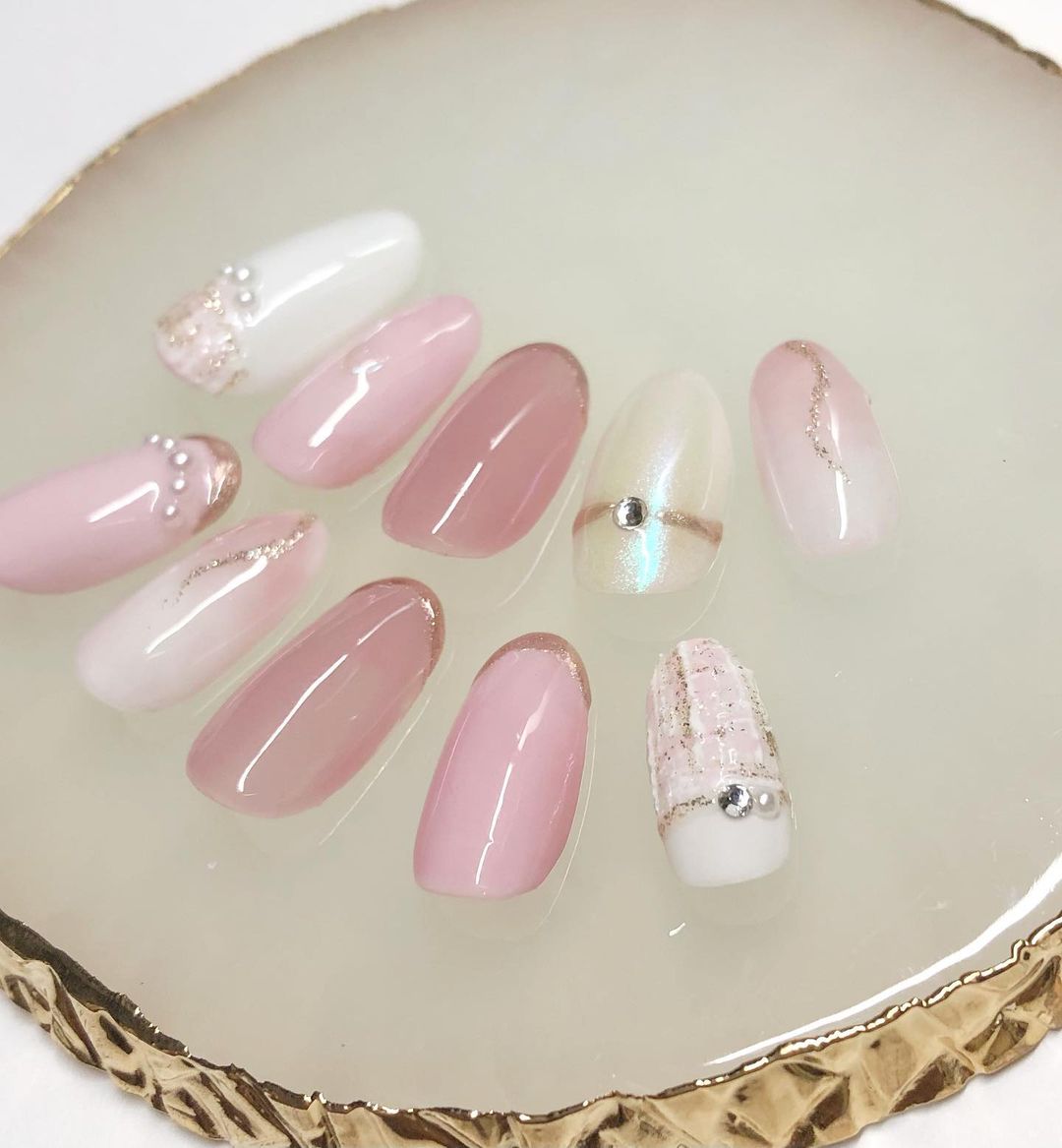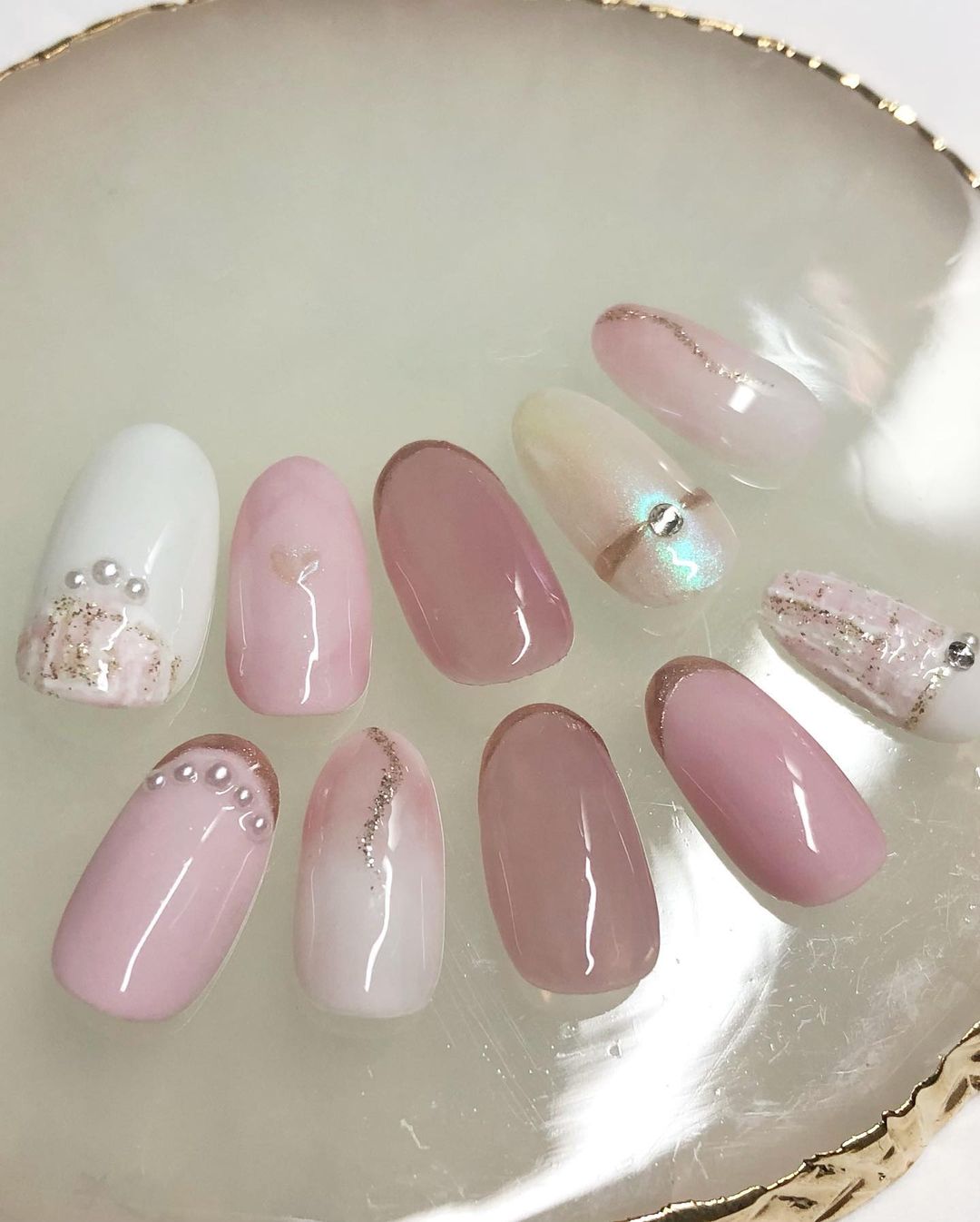 大人っぽいシンプルなデザインから、華やかデザインまで、多様なピンク系カラーのアートネイルを集めました!