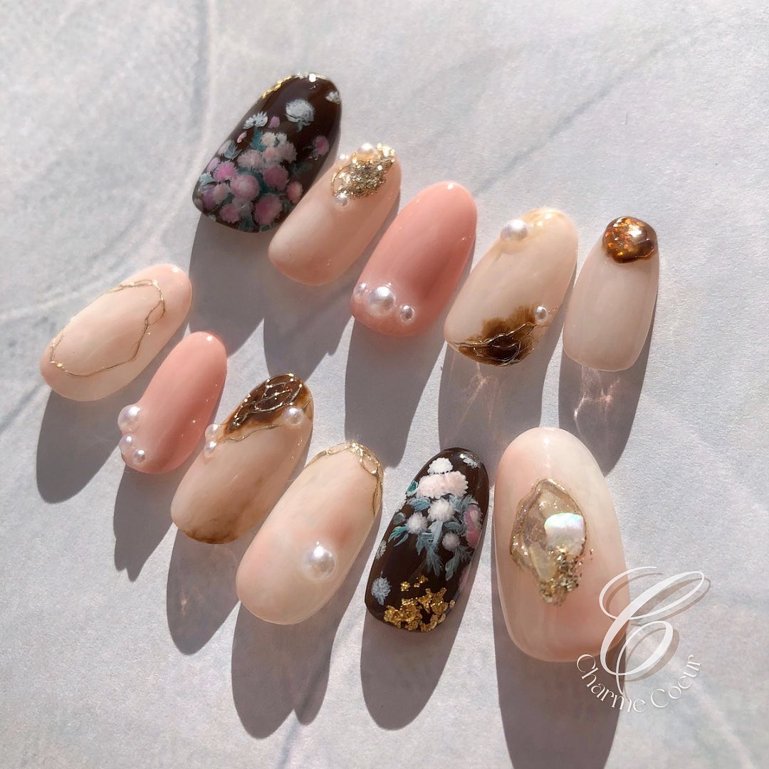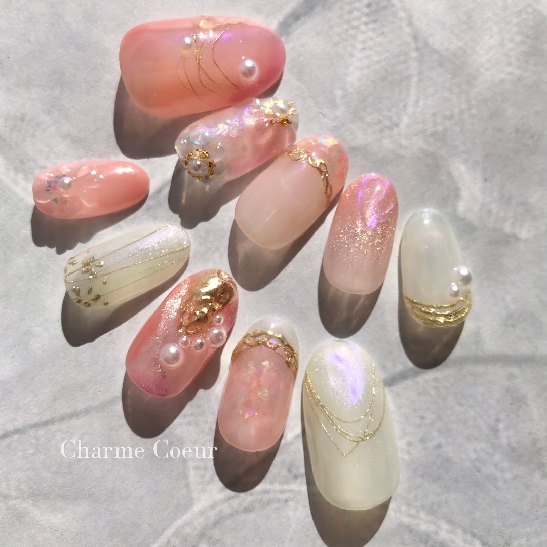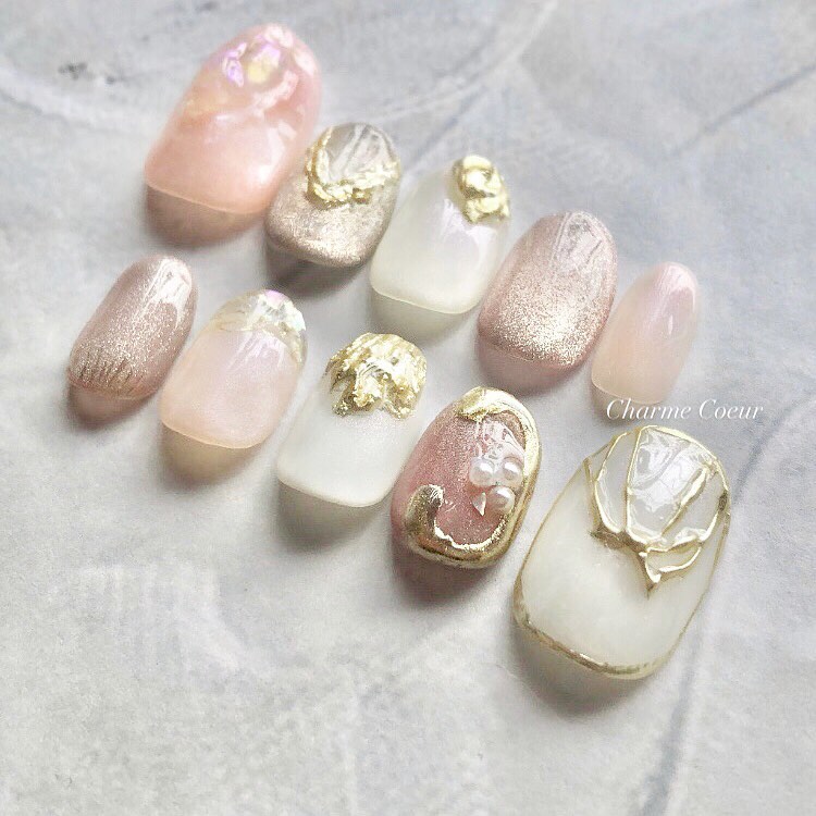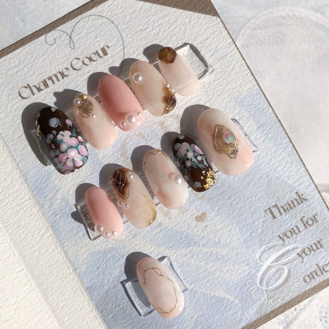 大人っぽいシンプルなデザインから、華やかデザインまで、多様なピンク系カラーのアートネイルを集めました!