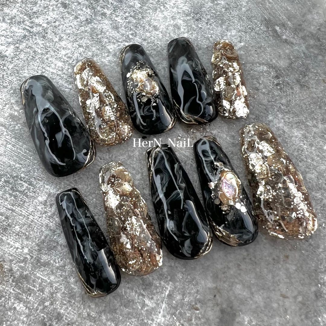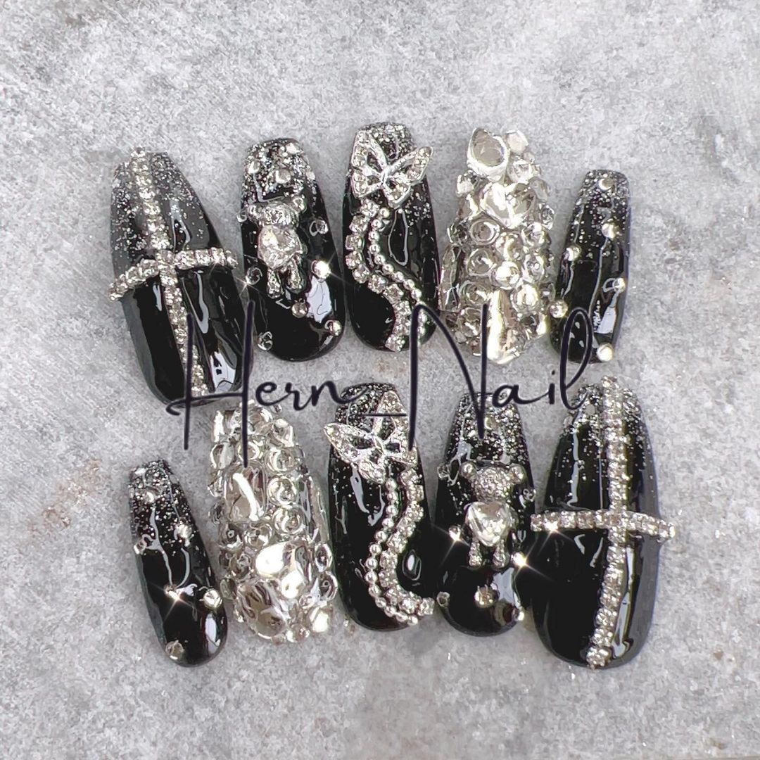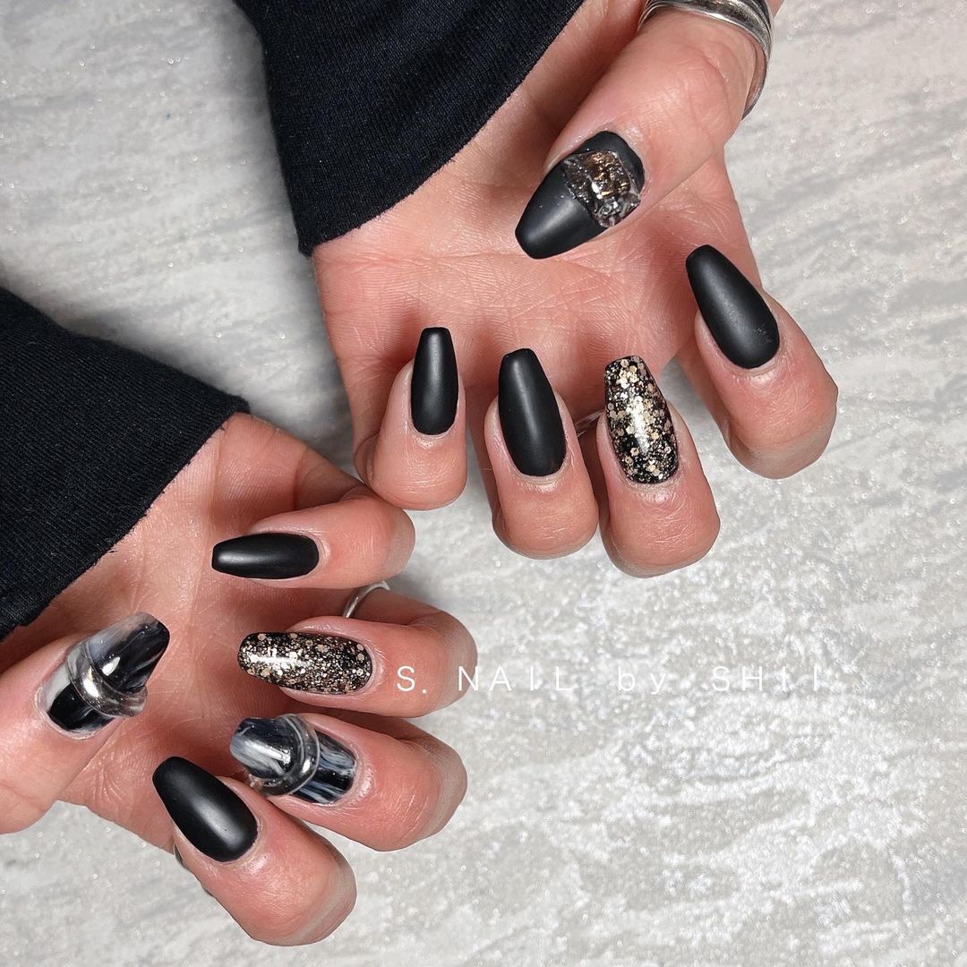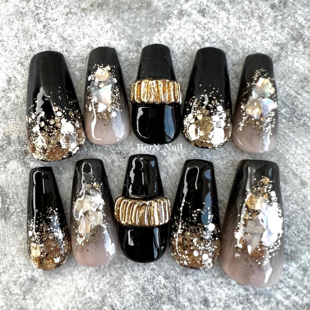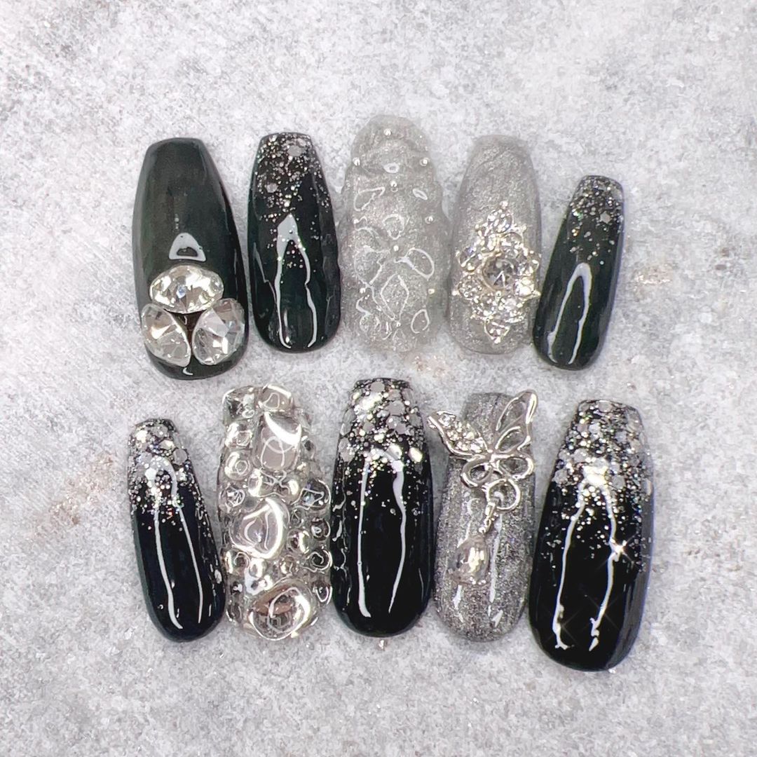 華やかなデザインに注目!きらきらかっこいいブラックネイル31選!