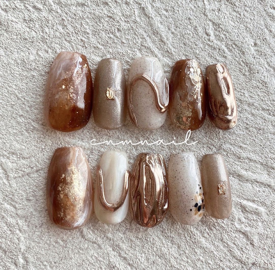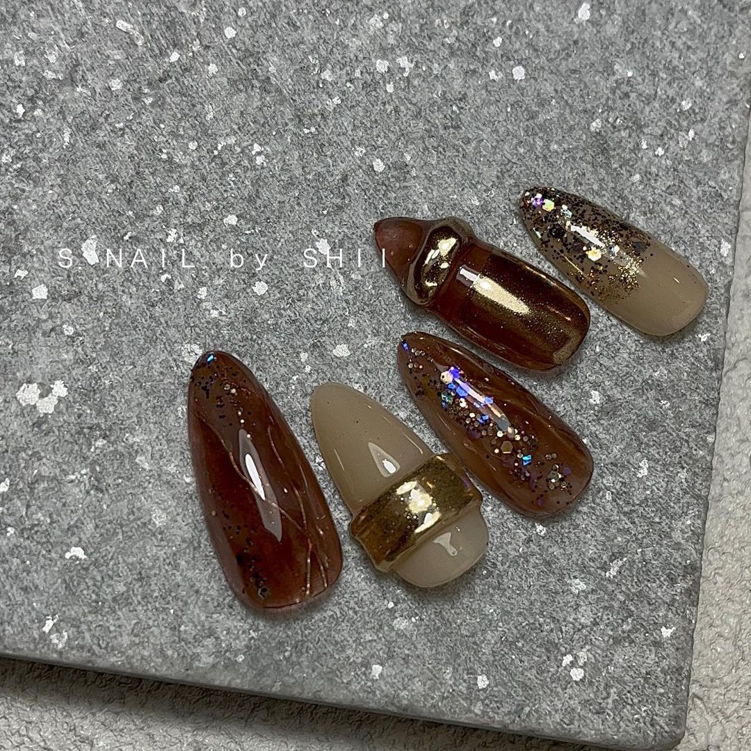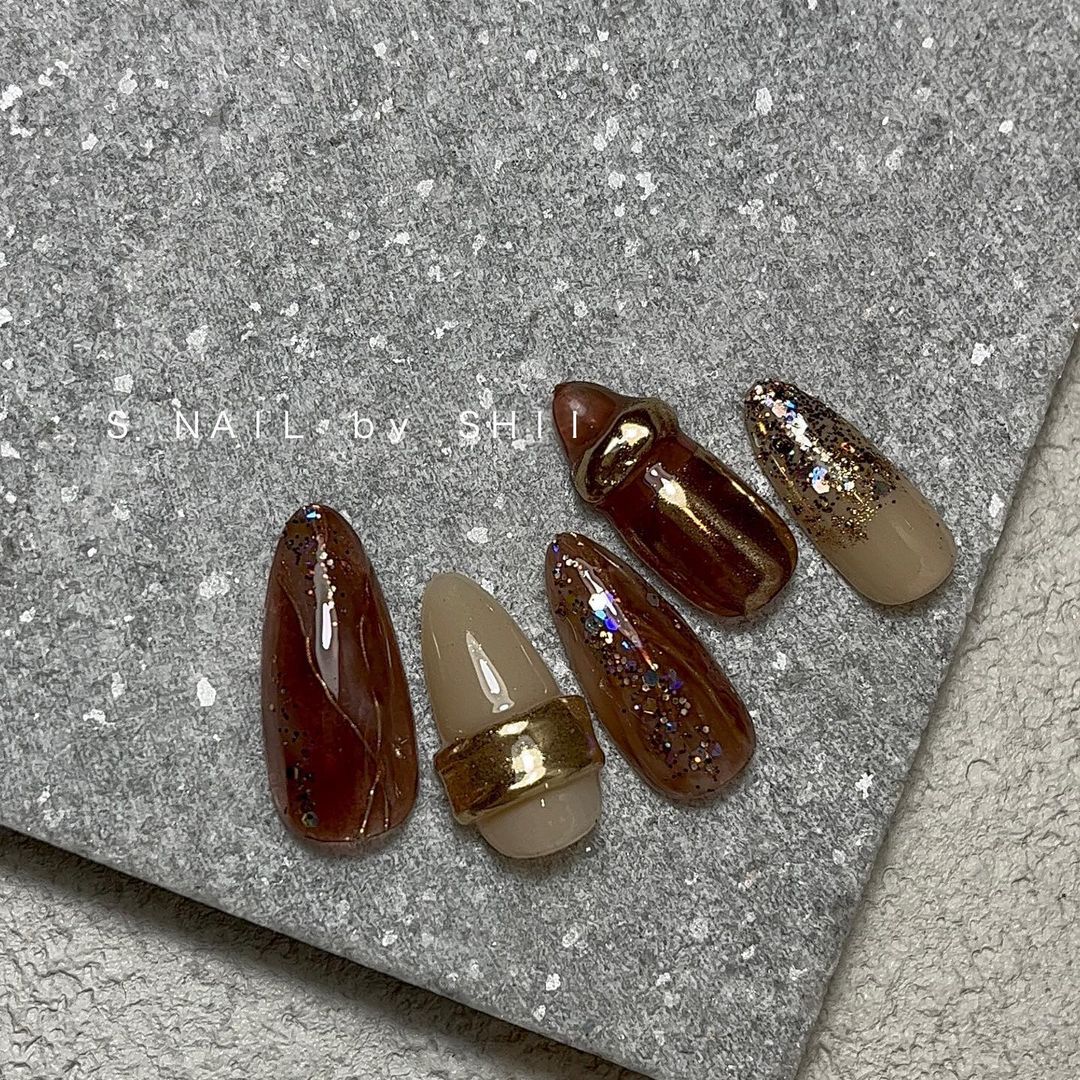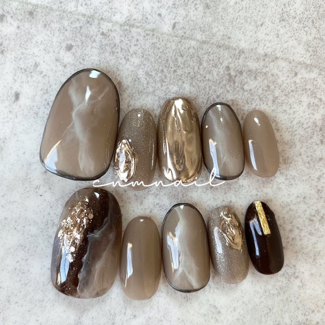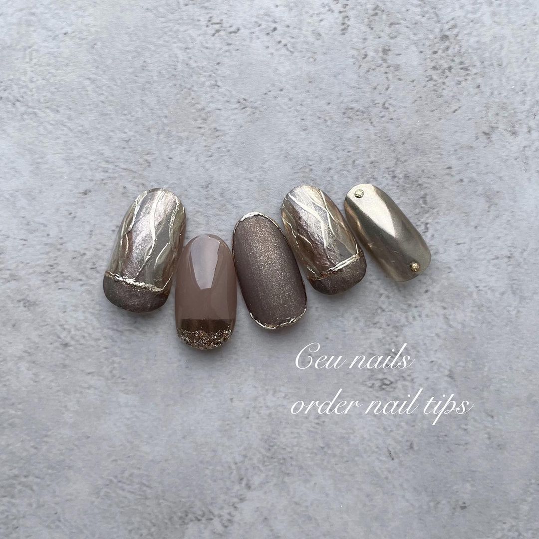 ブラウン系カラーのベースに、ゴールドなどのミラーを使ったネイルデザインを集めましたので、ぜひ参考にしてくださいね💅🏻