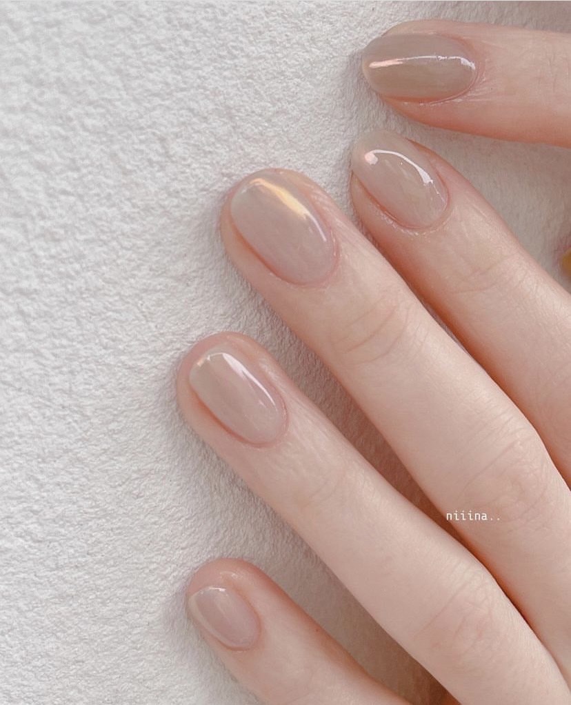 シアー乳白色〜グレー系でオレンジ系のミラーパウダーでどうでしょうか?