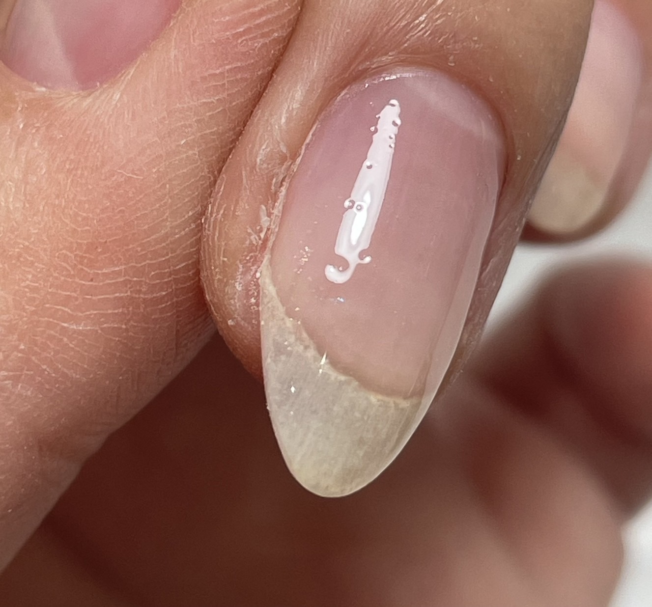この現象、ネイルチップ作る時に、ベース多めに塗りすぎると弾いてこうなる事があります🥹