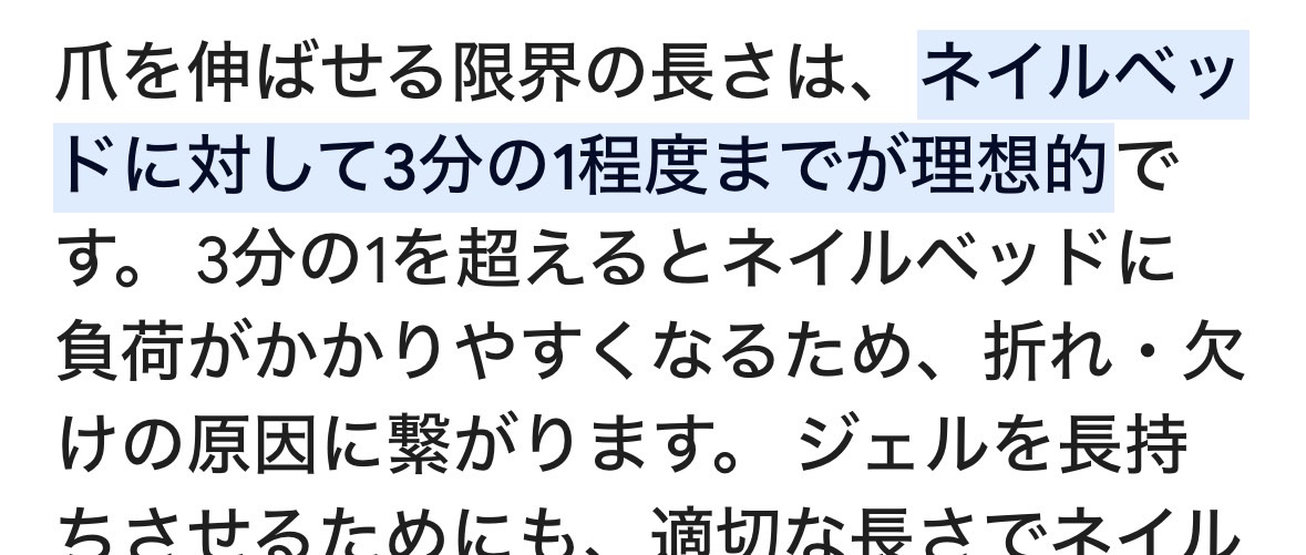 ただ、ここまで厳しくは取れないので、爪の薄さやお仕事・ベッドの長さ・爪の使い方・お客様の希望の厚さ・性格によっても厚さを変えてロング料取るか決めているため、明確な基準はございません🙏