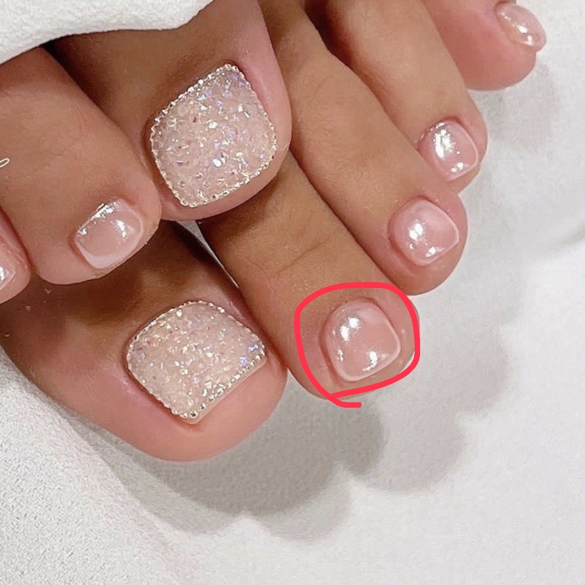 こんばんは★ シアー系のピンクのカラーの上に、ホワイト系のミラーパウダーでそのような感じになると思います。 何も塗ってなかったら、フリーエッジの白い部分が見えると思うので、、、。 解釈違いでしたらすみません🙇♀️
