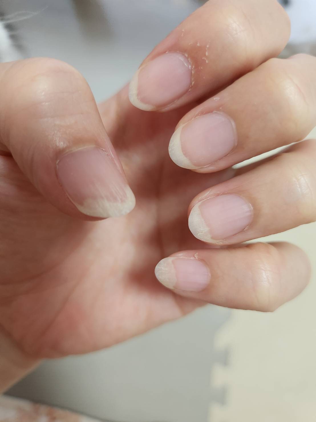 剥離はジェルする事で落ち着く場合もありますが、この方は2枚爪もあって乾燥してるように見えます。爪周りも。