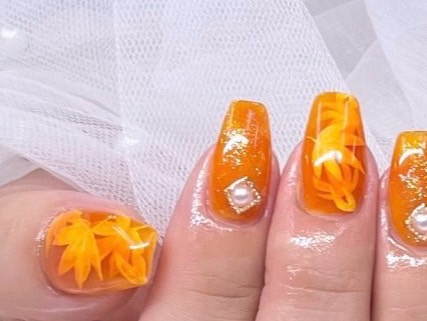 これは、シアーのオレンジベタで塗って、金箔ちょんちょんと乗せて、その上からまたシアーのジェルで、その上にまた金箔のせました!