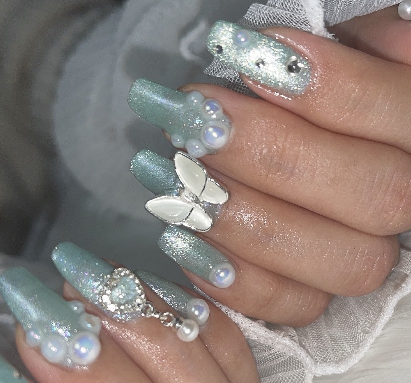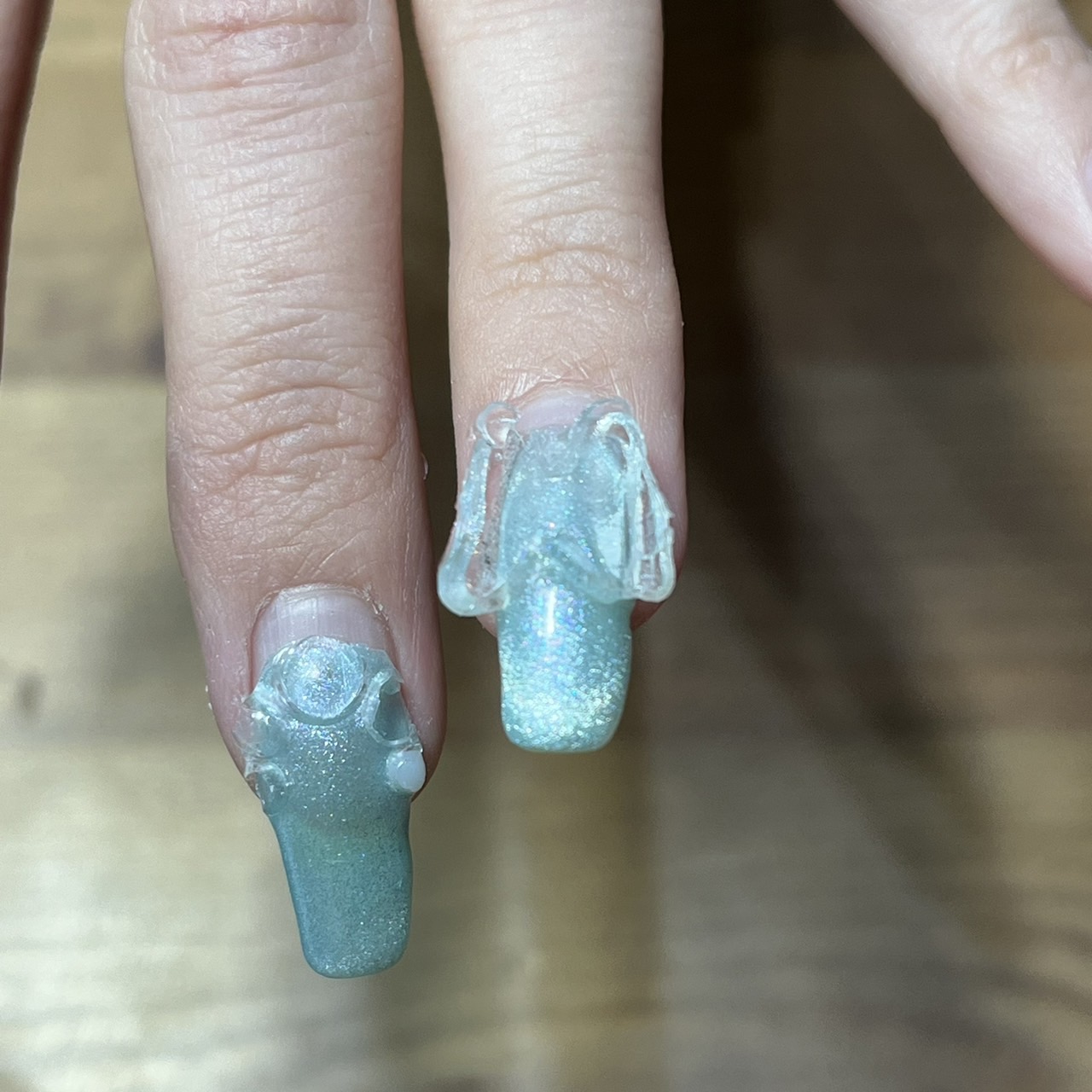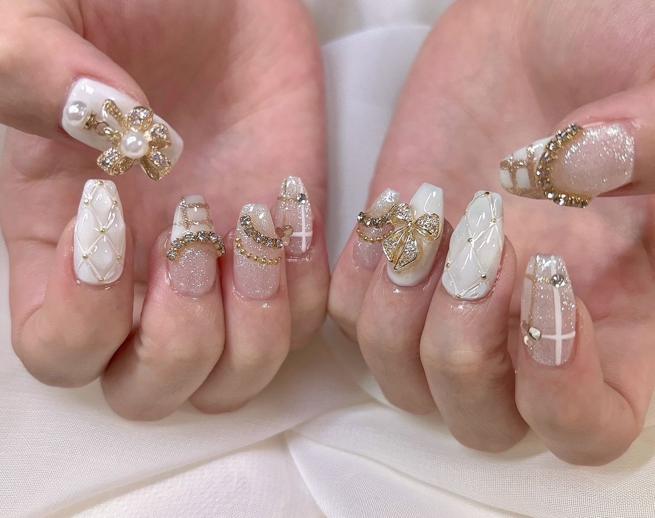 こんな感じのパーツをつけたい方が増えまして、今までパーツをつけないシンプルな方ばかり施術していたので不安があり、教えて欲しいです🙇‍♀️ リボンなど横が浮いているものは、中心のみ粘度のあるジェルで留めてokなのでしょうか? チェーンなどは、クリアの上に載せて上から(側面のみ?)ノンワイプ仕上げであっていますか? リボンも最後にノンワイプで大丈夫でしょうか?