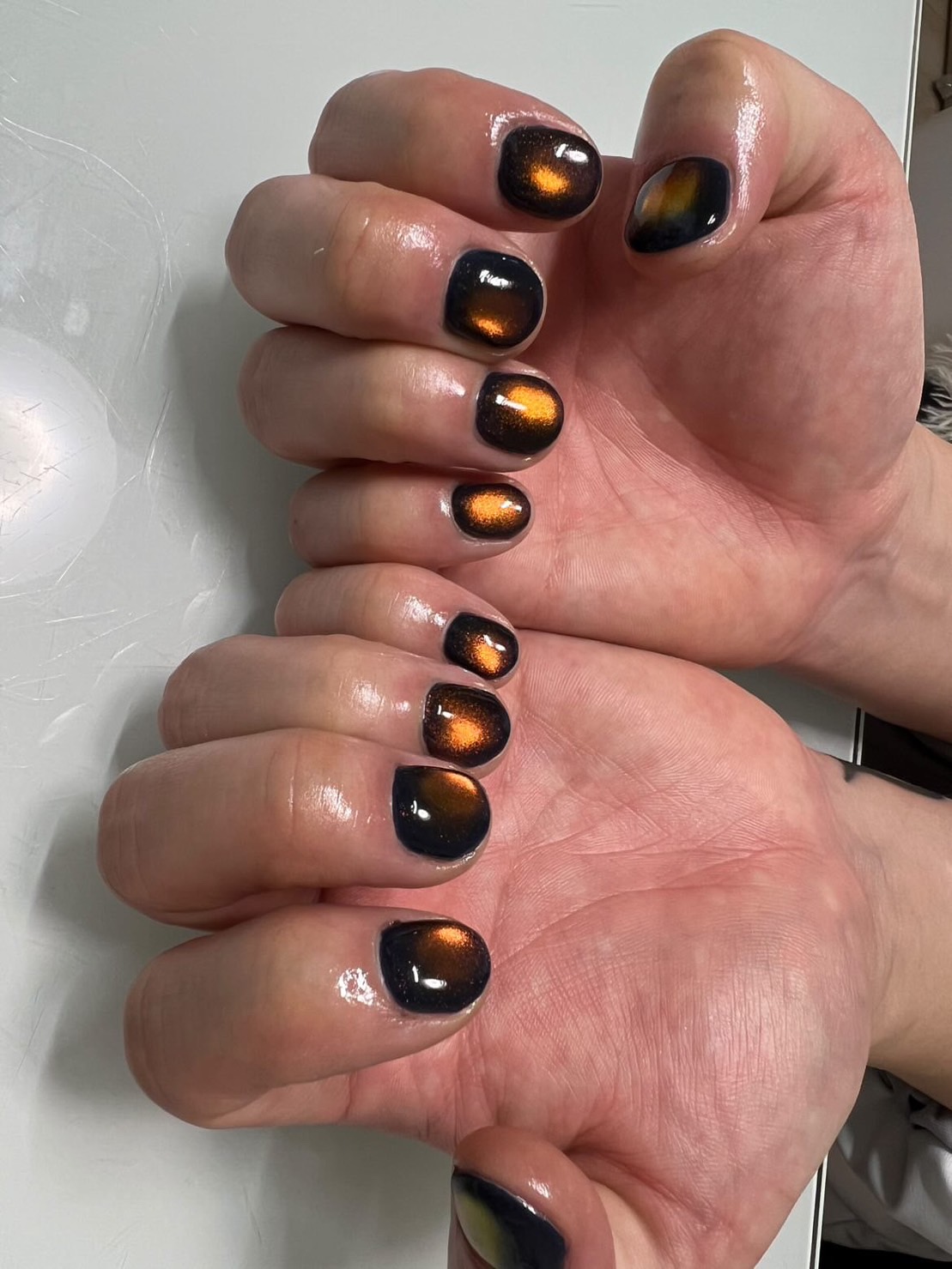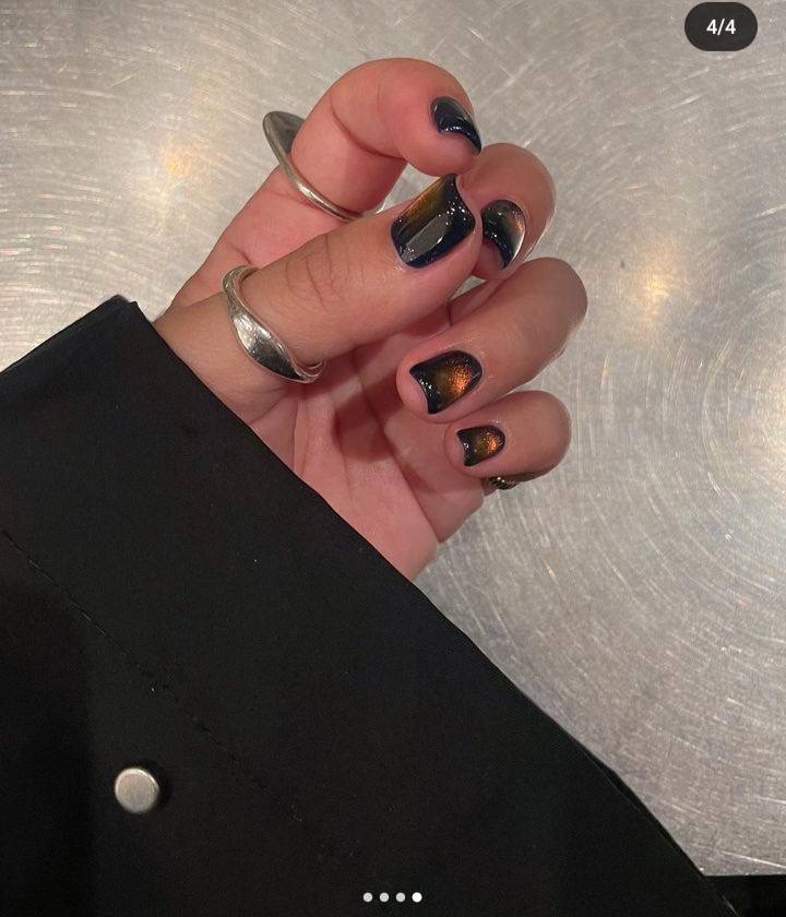 以前私も同じようなデザインやらせていただいたことがあるのですが、ネイビーを塗ったあとにlem.のオレンジマグを塗って、磁石を爪の周りをくるくるまわすと、こんな感じに仕上げられました🙆🏻♀️