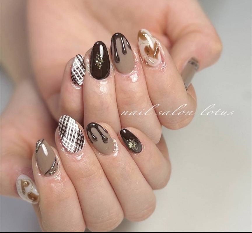 その後、紗々の柄を、テクスチャ硬めの焦茶とアイボリーホワイトのカラージェルで描いて硬化(長めにライトに入れてオーバーヒートさせてください)