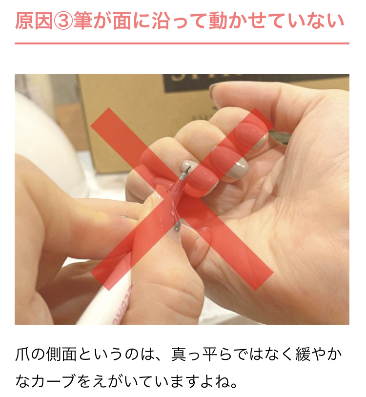 あと、他の原因は、サンディングがサイドまでできてなく、ジェルが弾いてる場合もあるかなと思います。