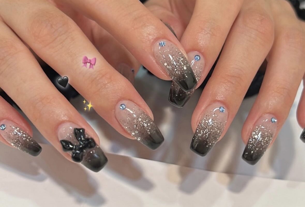 黒い細かいラメ、先端黒グラデ、シルバー荒いラメ真ん中だけ、パーツだと思います!