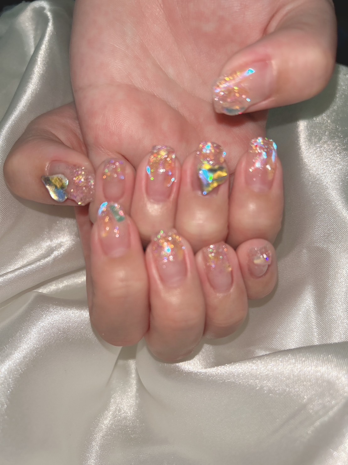 皆さんにお聞きしたいのですが、⬇️のデザインをするのに何を使われますか⁇ お客様がされたいのですが、オーロラのラインストーンを置くくらいしか分からなくて😱💦 よろしくお願いします🙇‍♀️