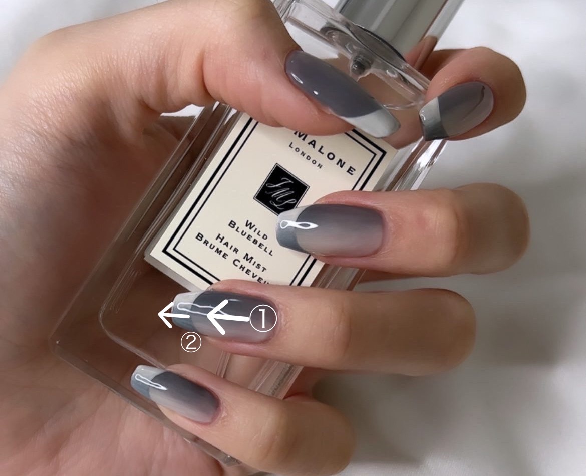 自己流ですが、私は①側を先に縦グラデして硬化してから、②の所を重ねて縦グラデします💅✨