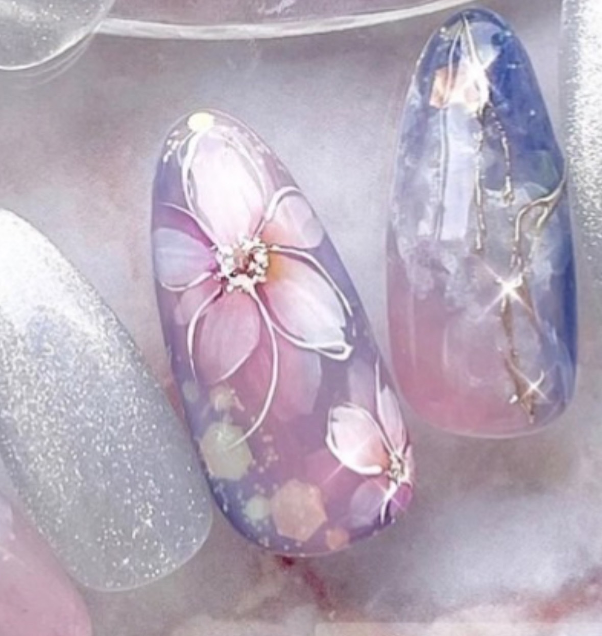 カラー(ピンク&ラメ)→花びら→花びらにカラー(ピンク)→クリア(&ニュアンスブルー)→花びら→花びらにカラー→クリア→細い線や花芯