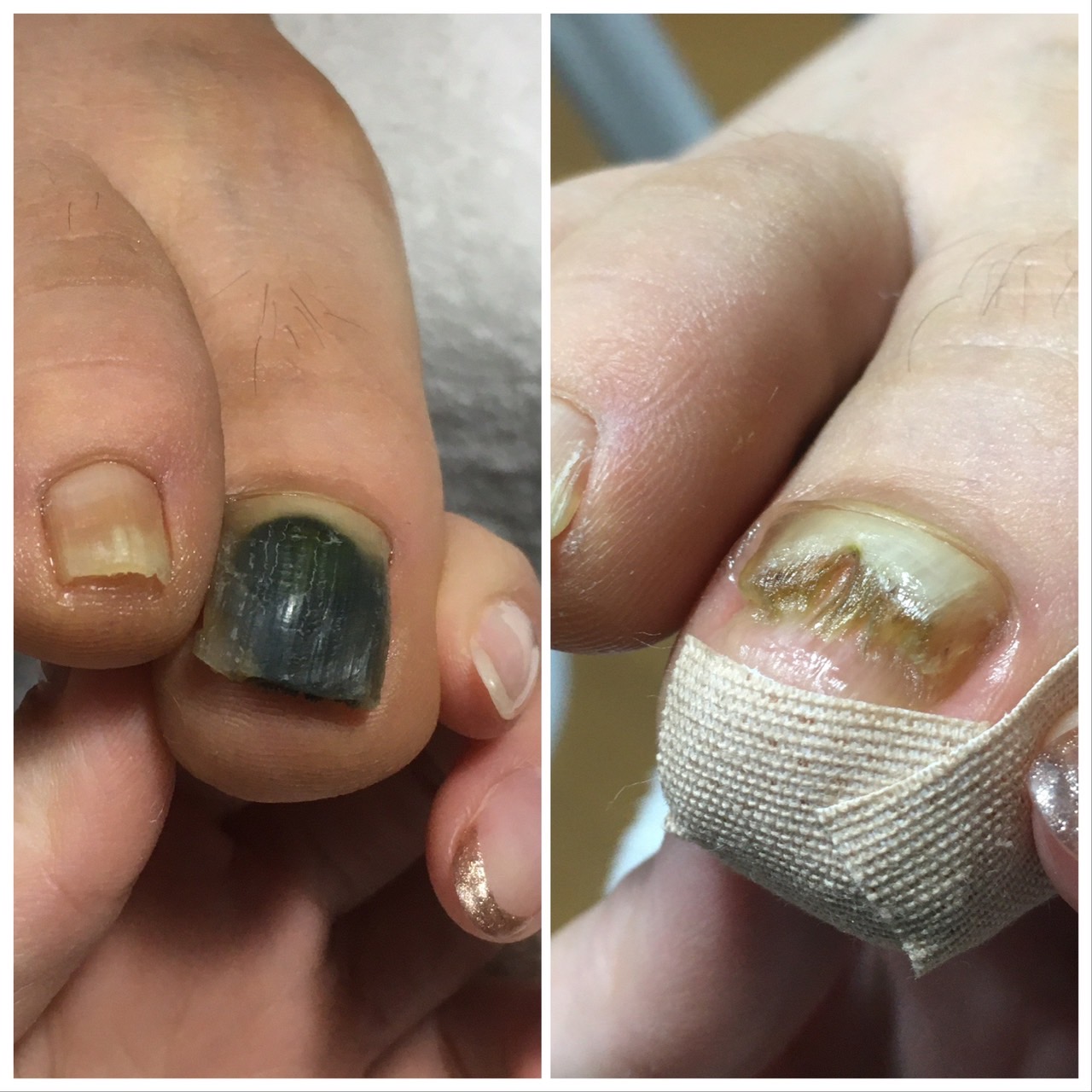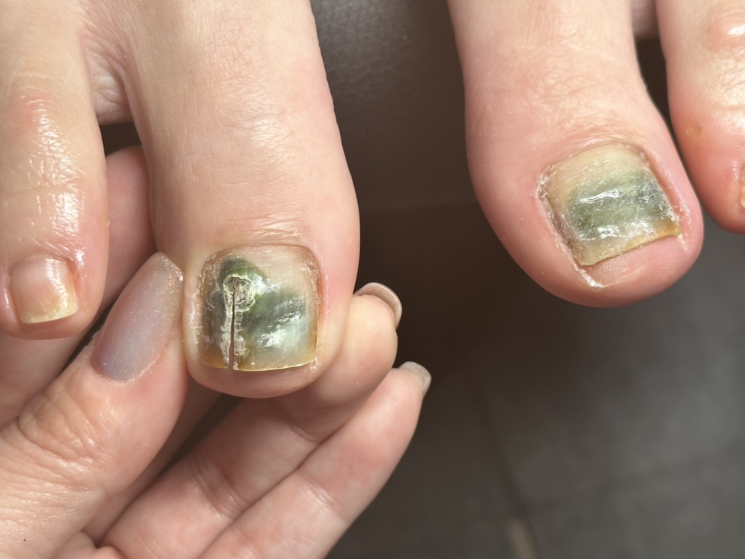 巻き爪の治療を終えたお客様にフットネイルをしたところ3分の1まで剥離しグリーンになっていました。