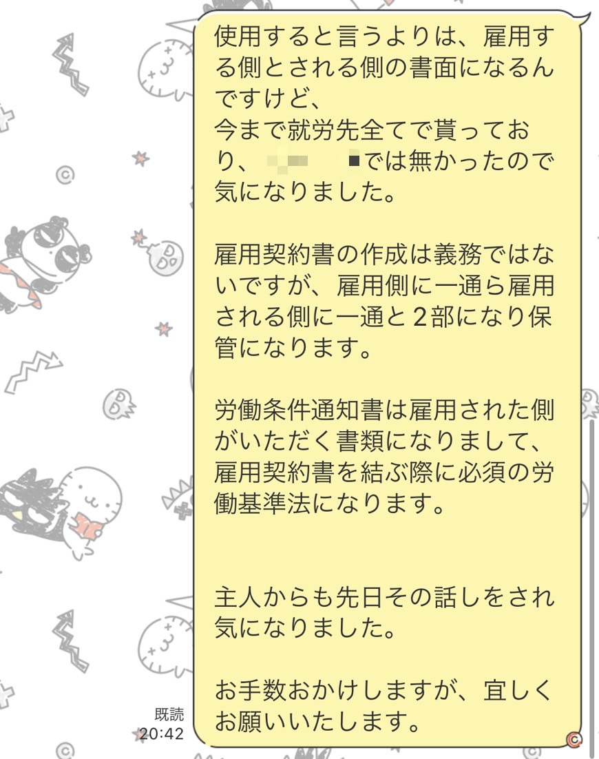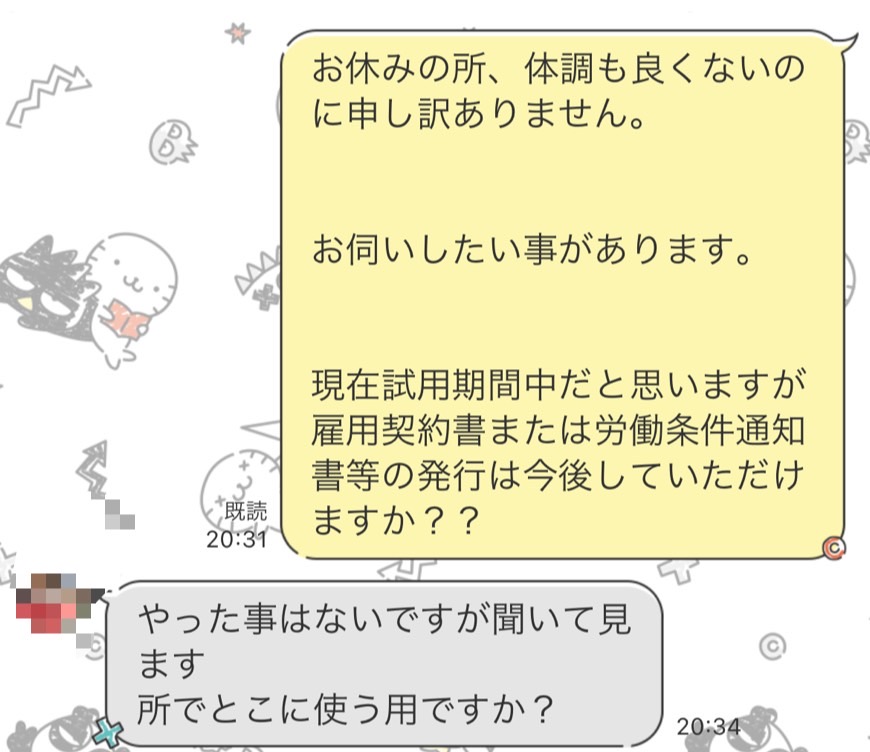 ですよね… 本採用でなかったとしても、給料が発生してる時点で労働条件通知書は法律で決まってますもんね… ちょっと明日出勤なのでオーナーに確認してみます💦 ありがとうございます😭