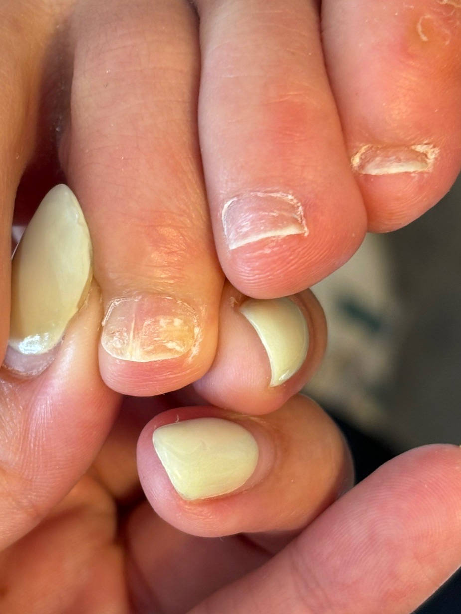 ご相談させてください。 フットネイルに来て頂いたお客様で、このお爪の剥離とも言えない黄色い変色と縦割れの予兆、また小指の間にこのような荒れがあり、水虫なのではないかという可能性を鑑みて、オフのみにさせて頂いて病院に行っていただくようお願いしました。 この判断は正しかったのか、また皆様だったらどのようにするか、ご意見頂けるとありがたいです。 よろしくお願い致します🙇🏻♀️