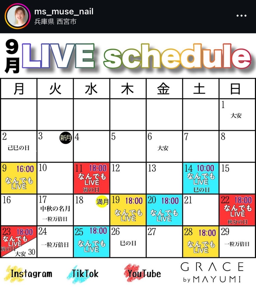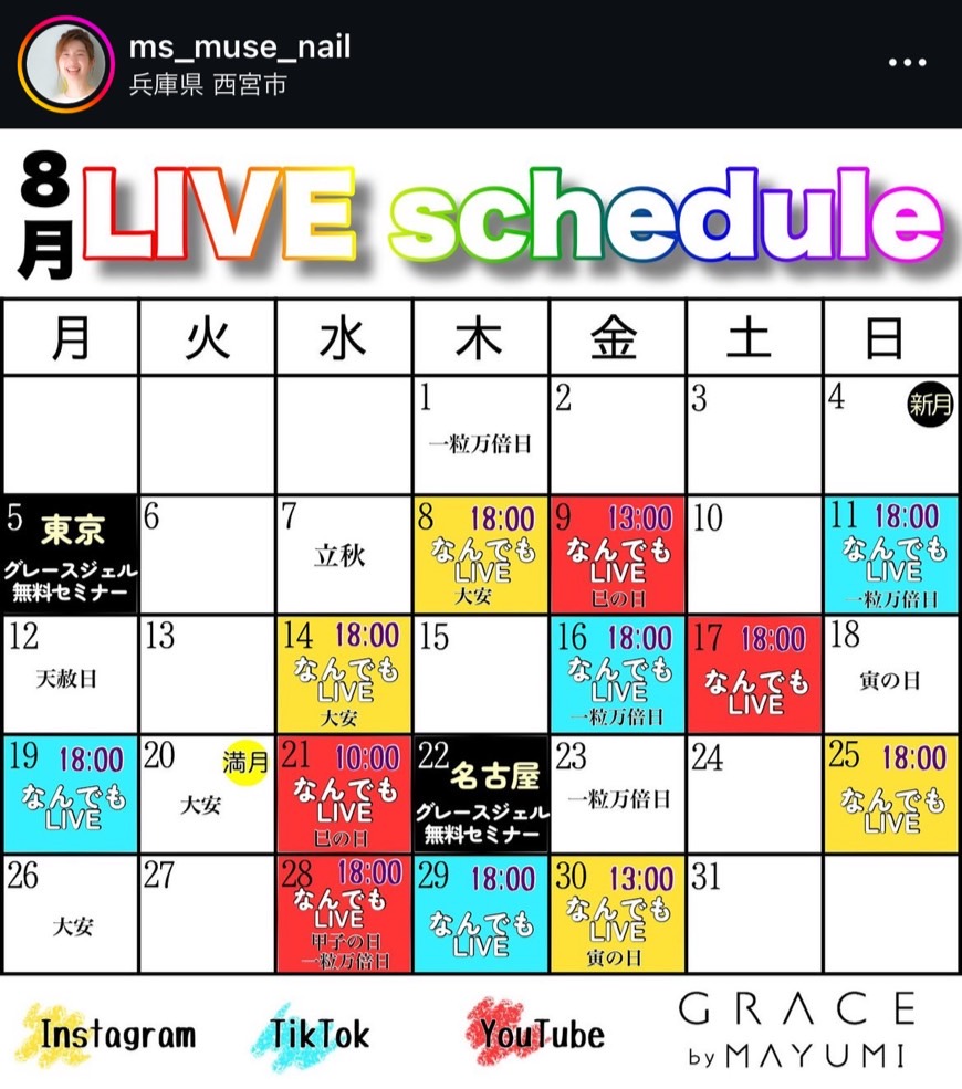 ありがとうございます! グレースジェルのベースとスカルプチェア買ってみます😊   ちなみに、ライブはインスタライブなどですか?🙇