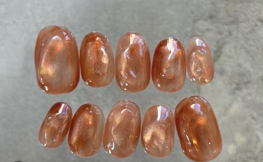 最初にオーロラ部分的に入れる→オレンジ・ベージュのシアーカラーでニュアンス→マグ部分的に入れる→オーロラ部分的に入れる→濃いめのシアーオレンジもやもや→ぷっくり→トップ