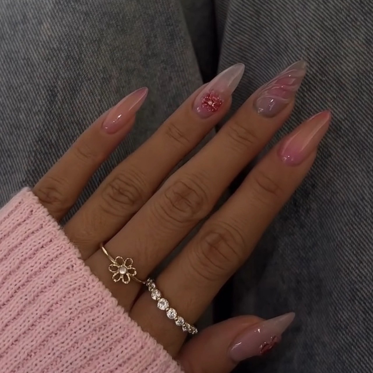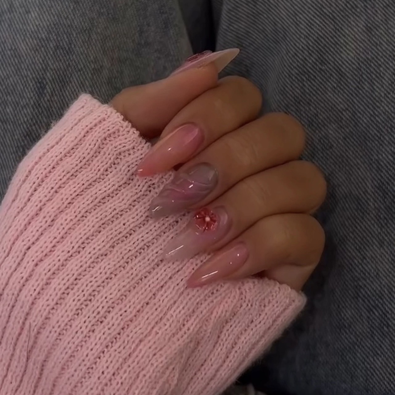 韓国のチュルチュル系ネイルのお持ち込みが、手法が難しくて苦手です😭 この画像はマグではなくうるぱでしょうか? 人差し指と薬指のようなデザインはエアブラシだと思いますか?