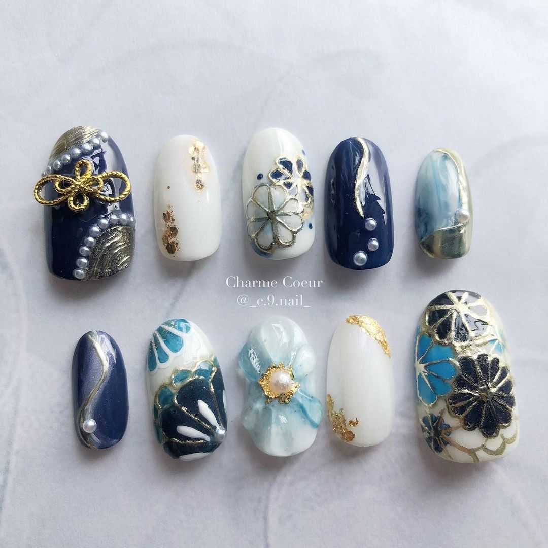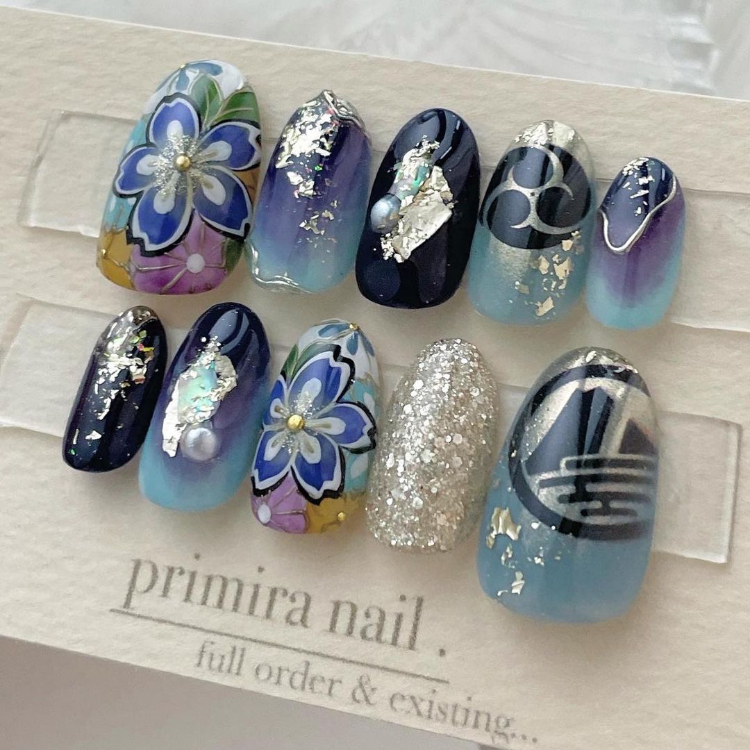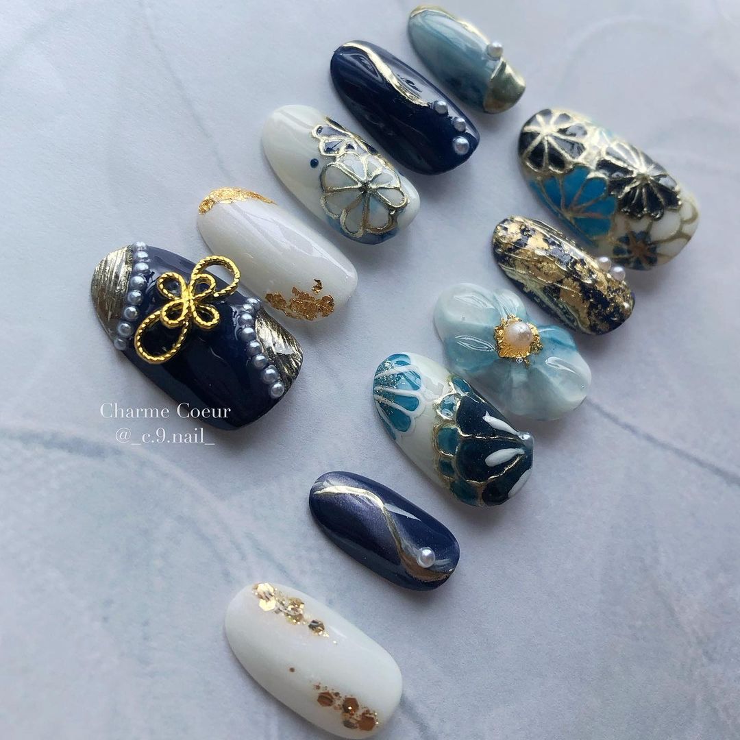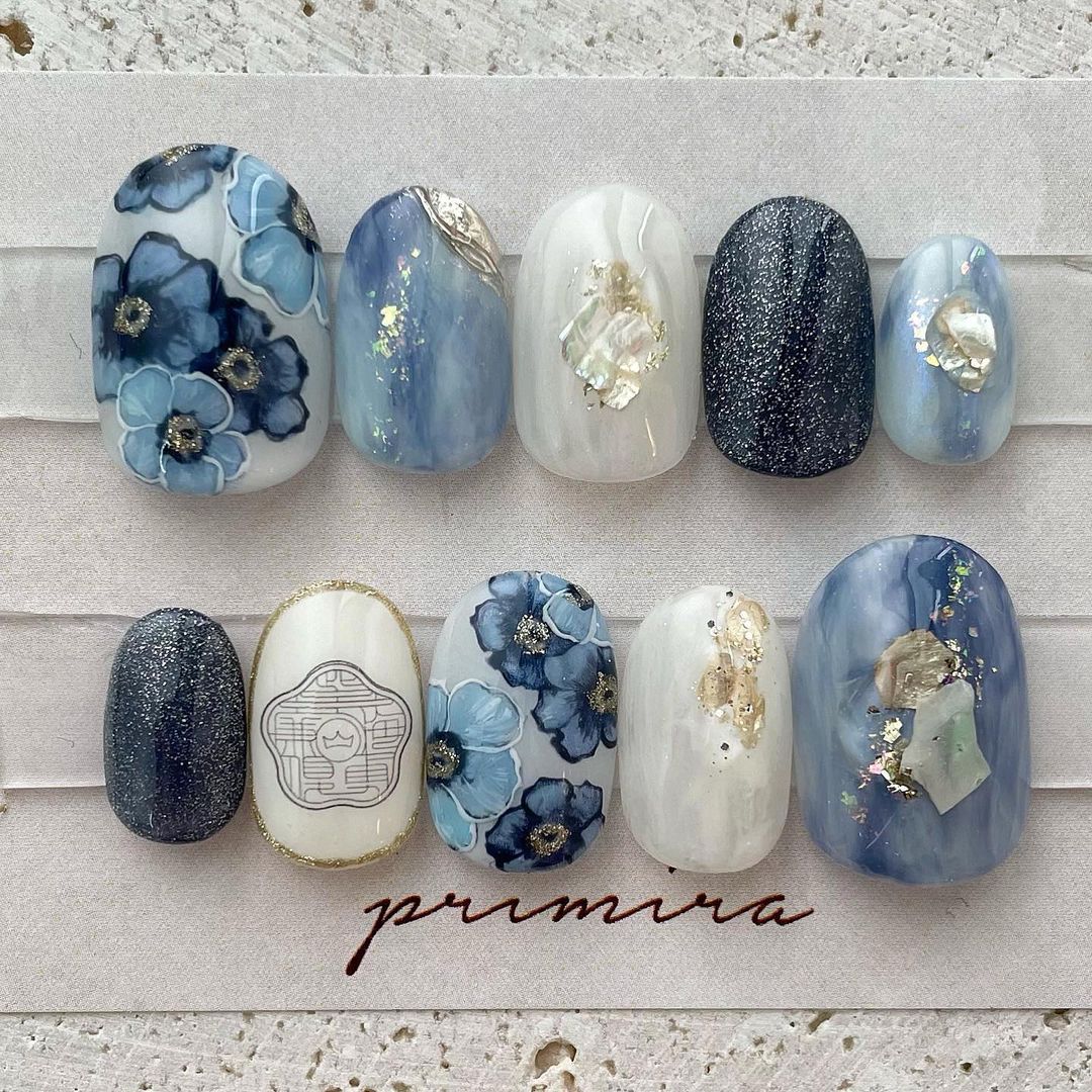 振袖や袴など和装の日に!ブルーカラーの和柄ネイル68選!