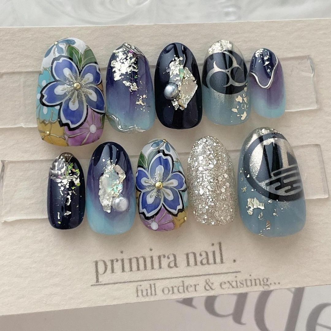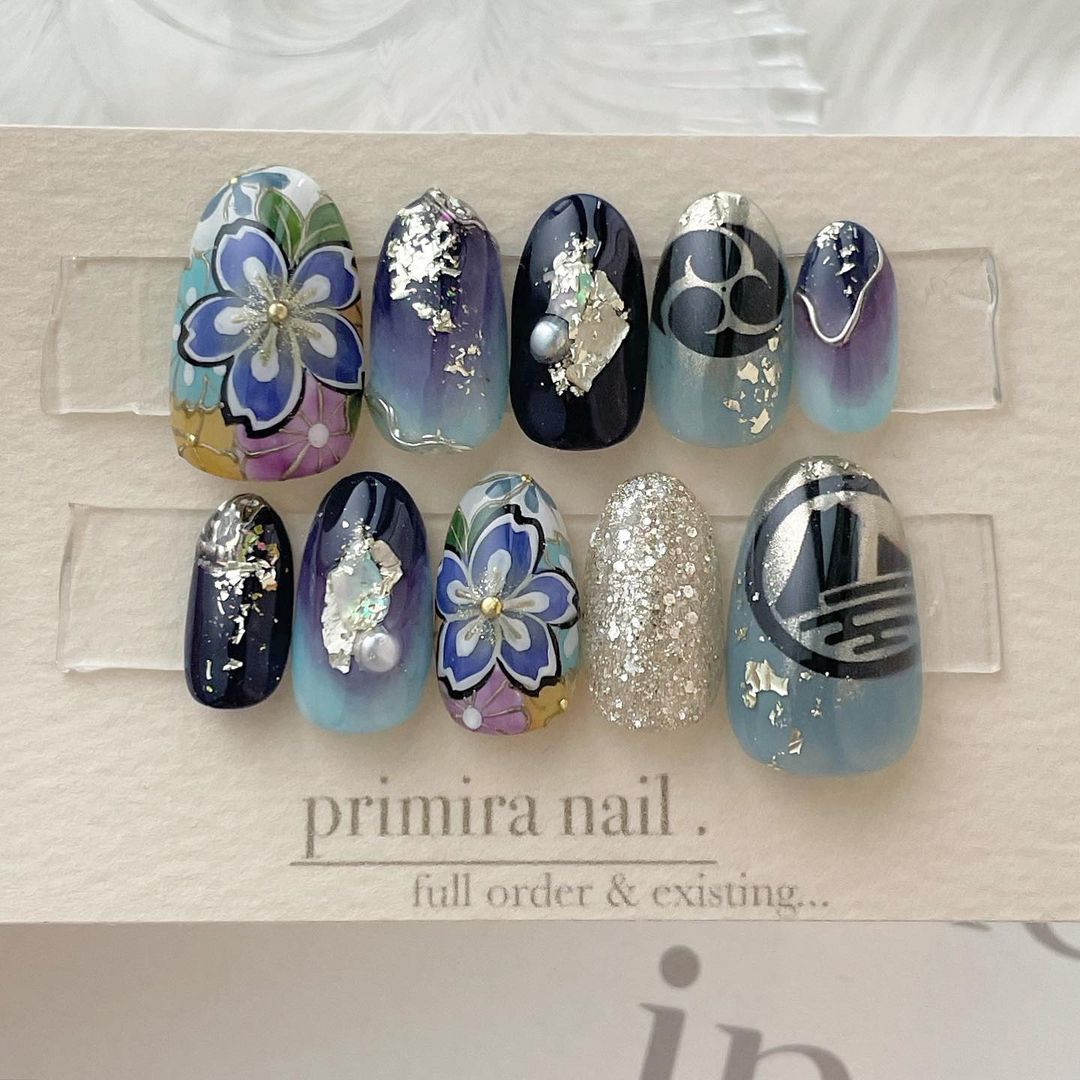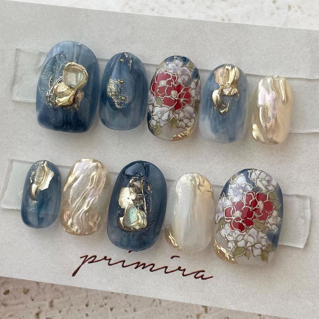 振袖や袴など和装の日に!ブルーカラーの和柄ネイル68選!