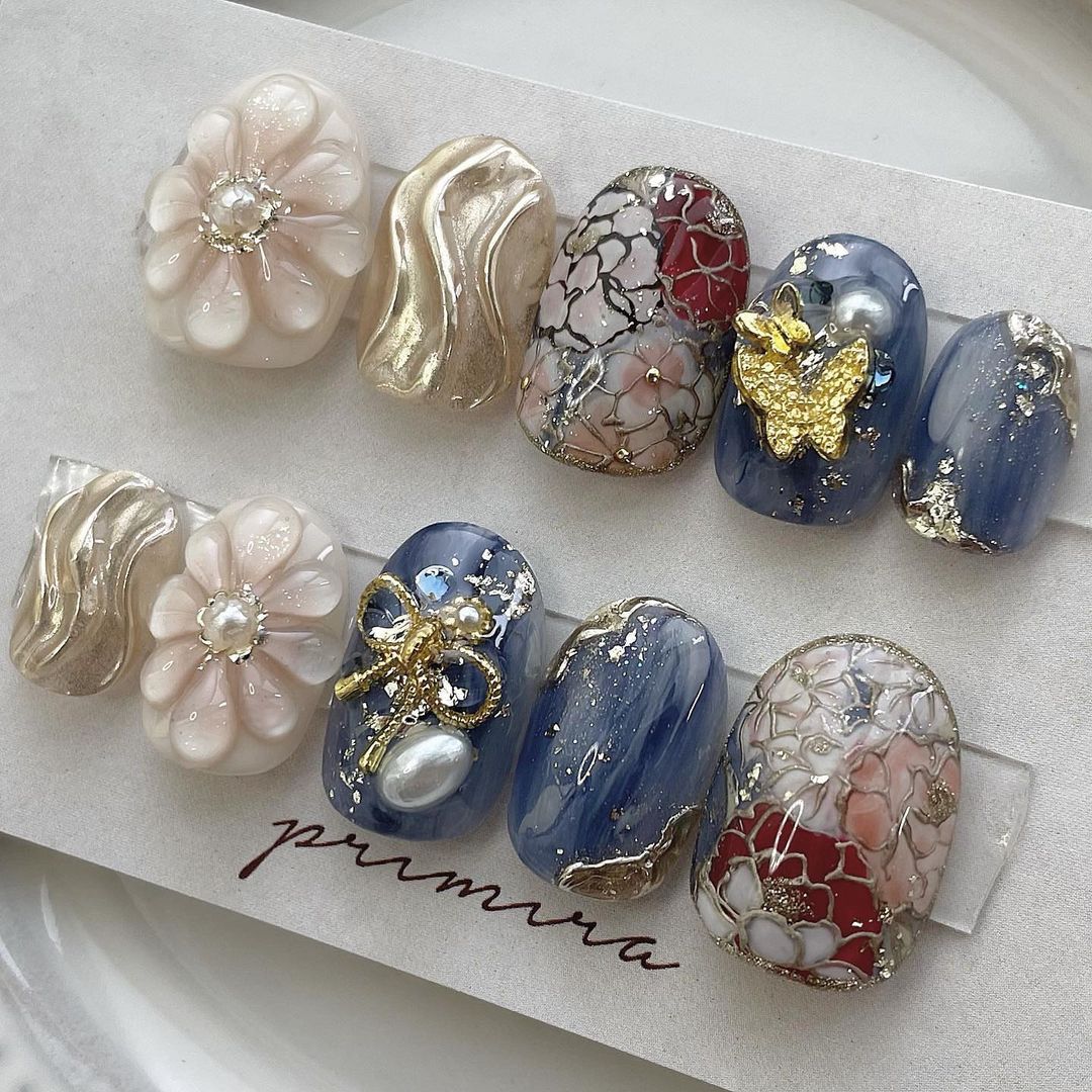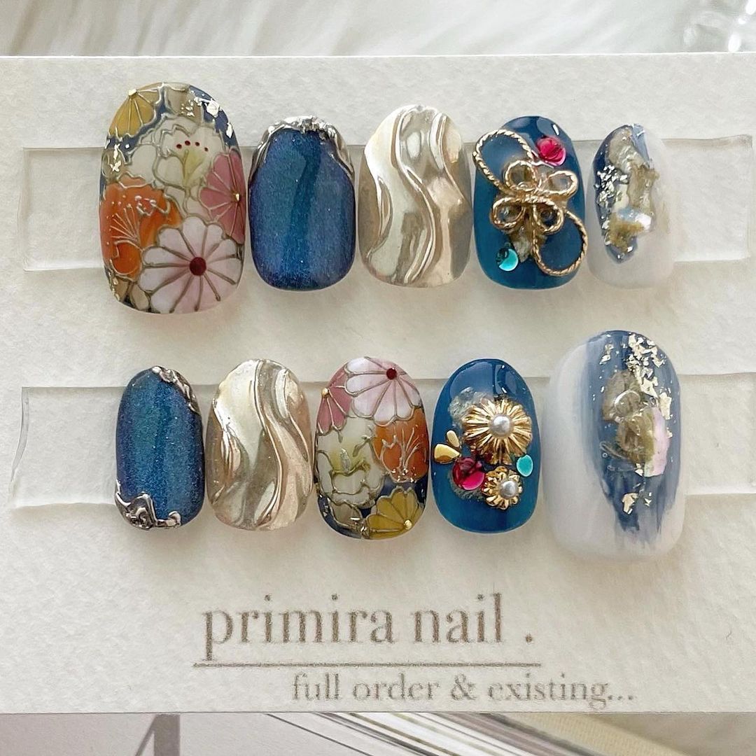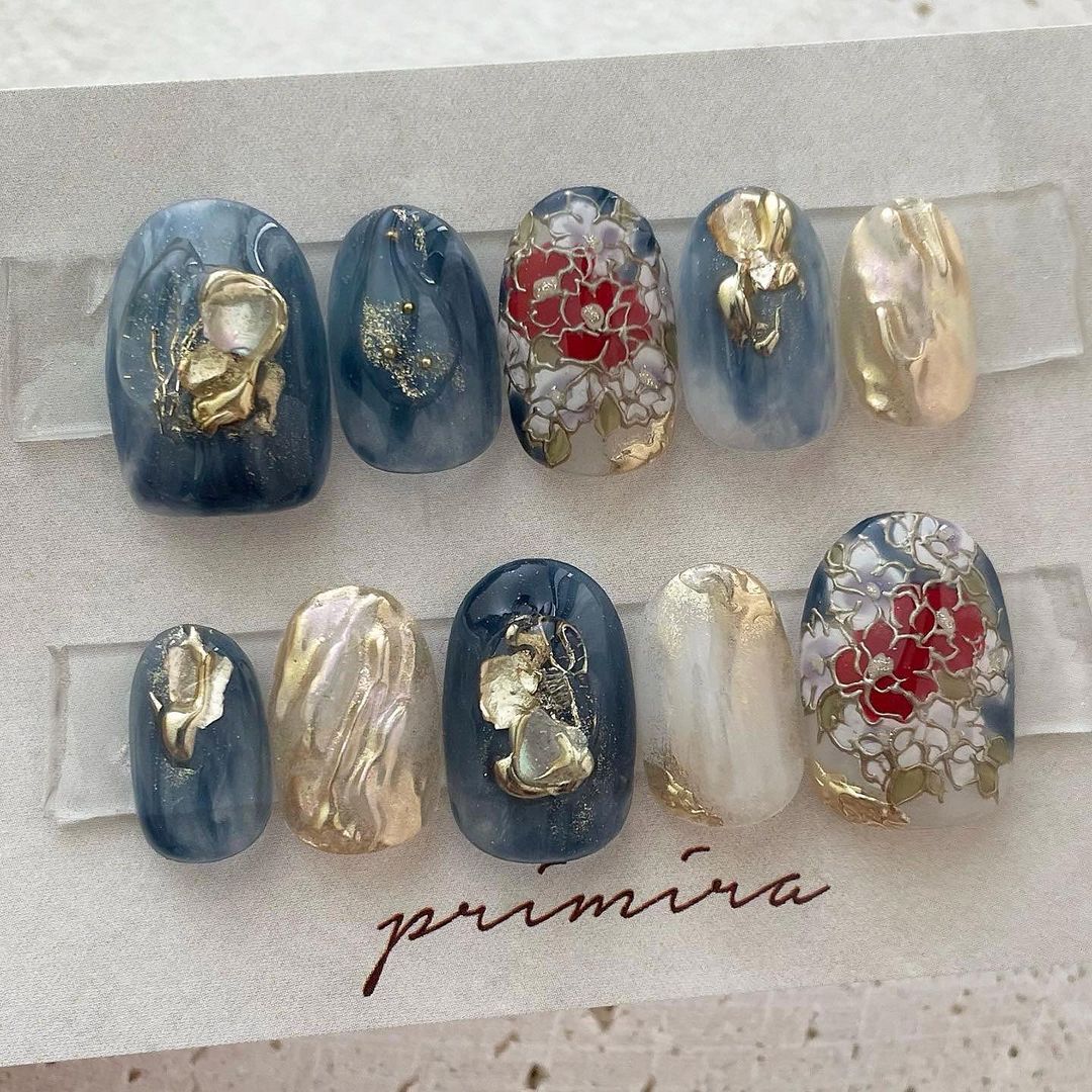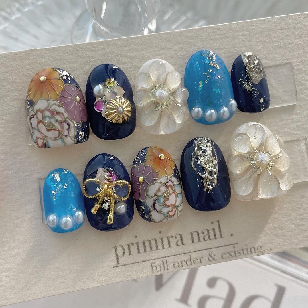 振袖や袴など和装の日に!ブルーカラーの和柄ネイル68選!