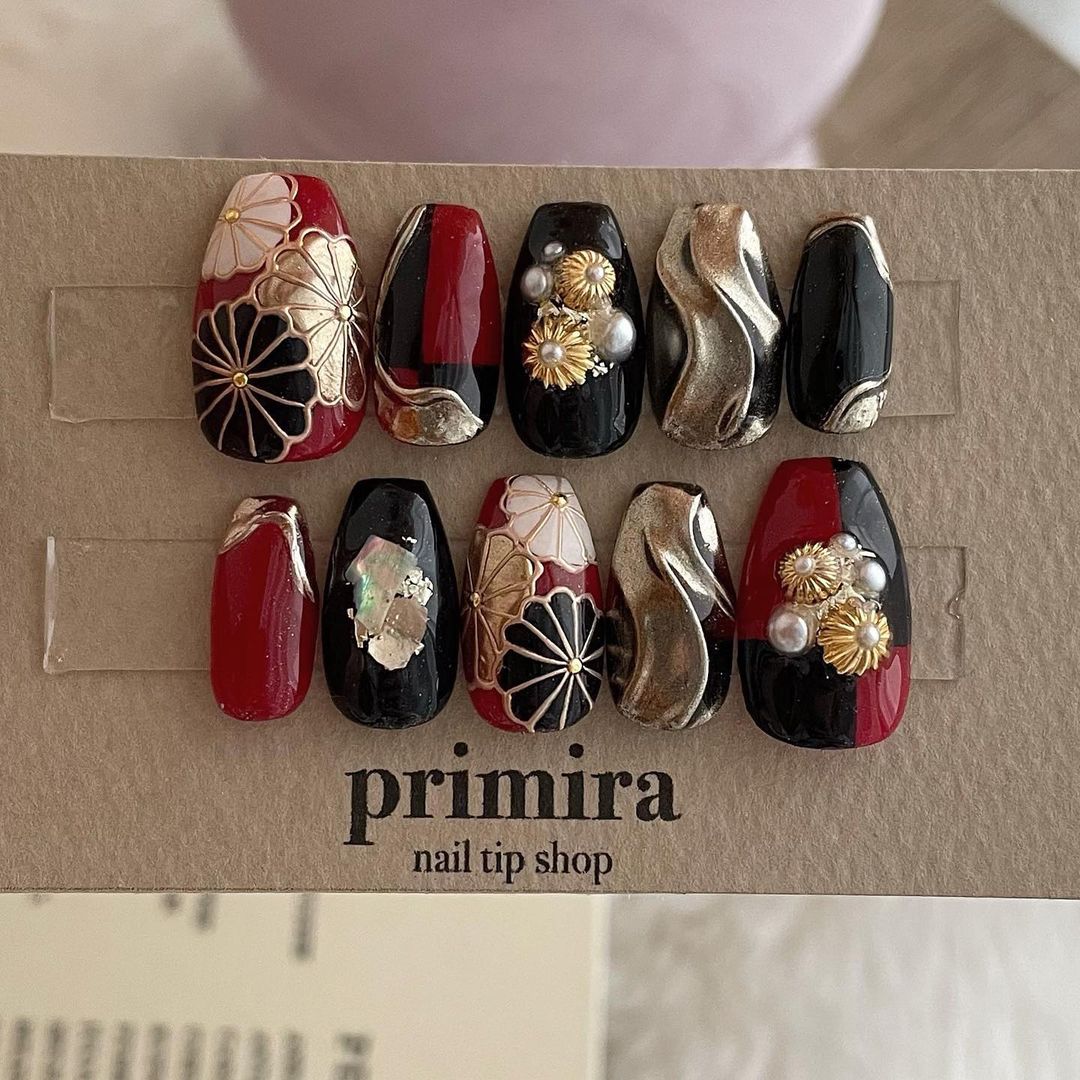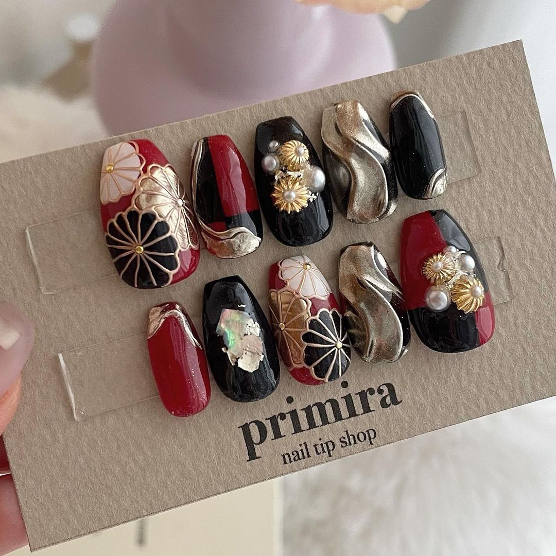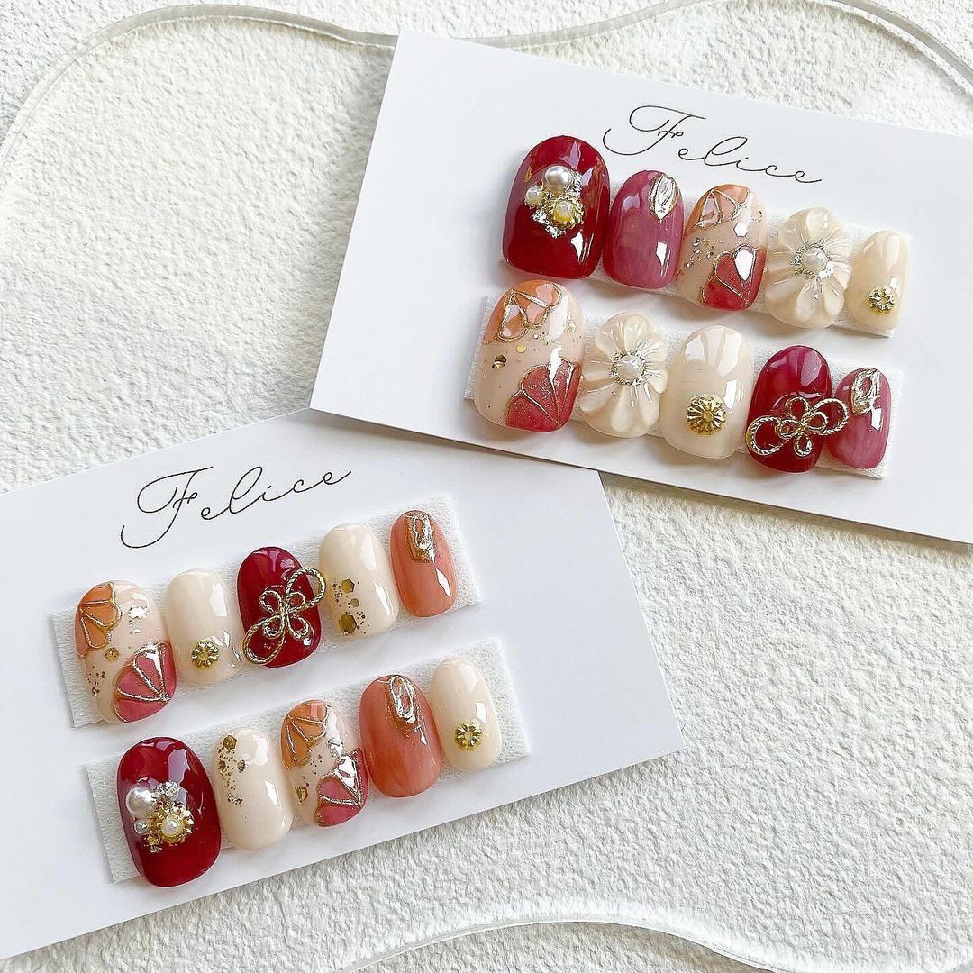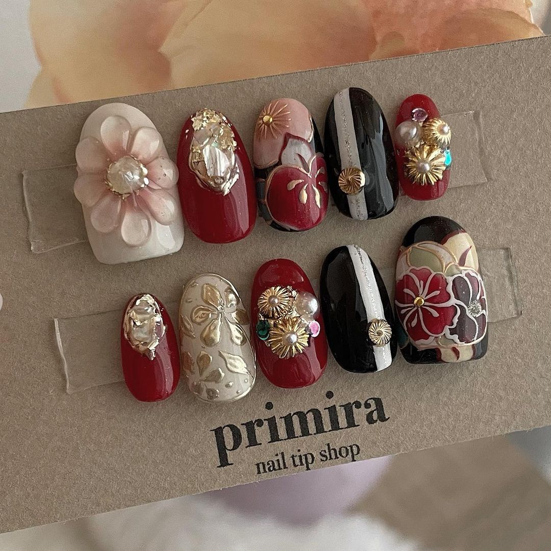 ぷっくりフラワーの綺麗めデザインからパーツを使った派手めのデザインまで、赤系の和柄ネイルを集めましたので、ぜひ参考にしてくださいね💅🏻