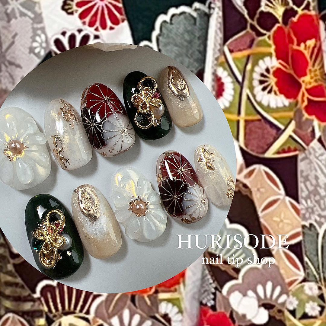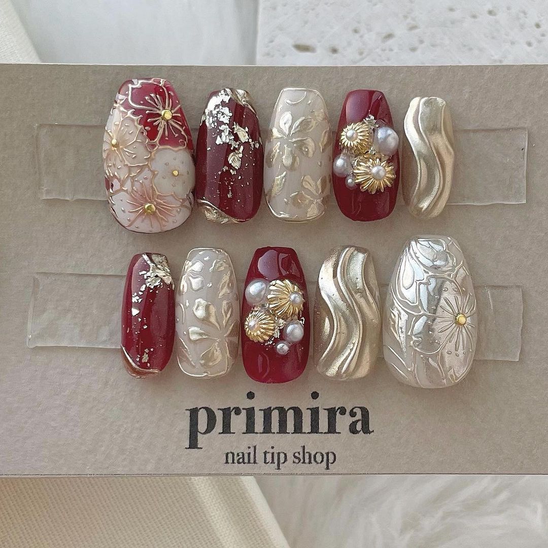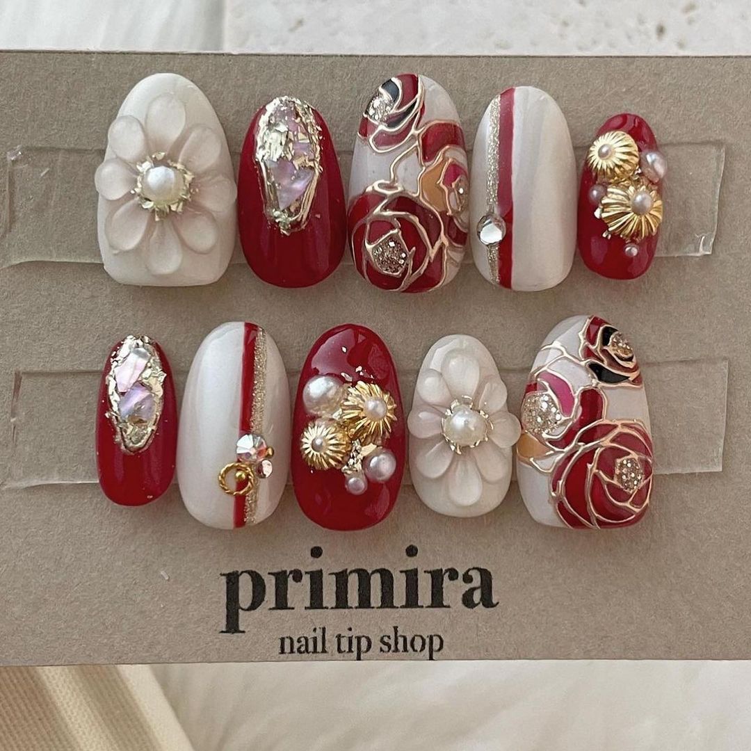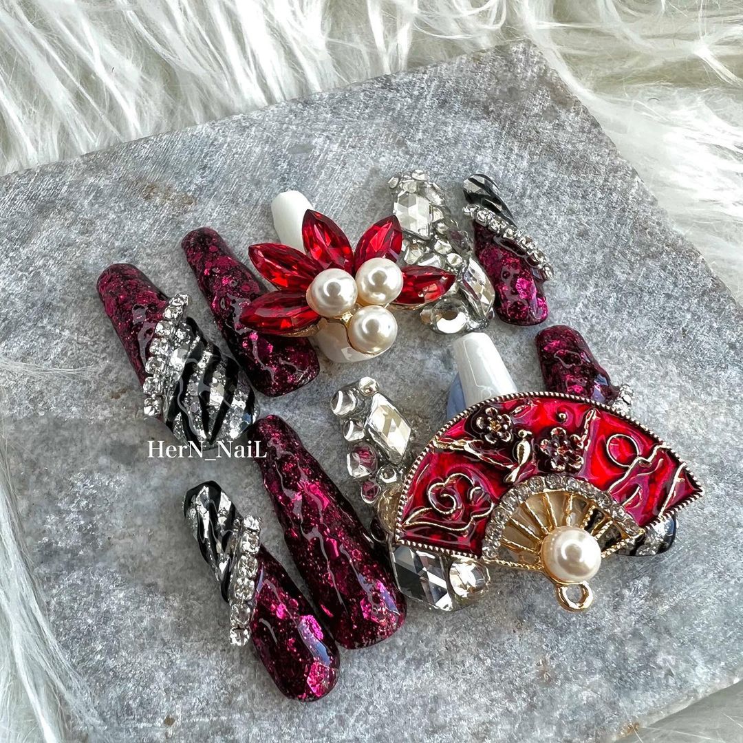 ぷっくりフラワーの綺麗めデザインからパーツを使った派手めのデザインまで、赤系の和柄ネイルを集めましたので、ぜひ参考にしてくださいね💅🏻