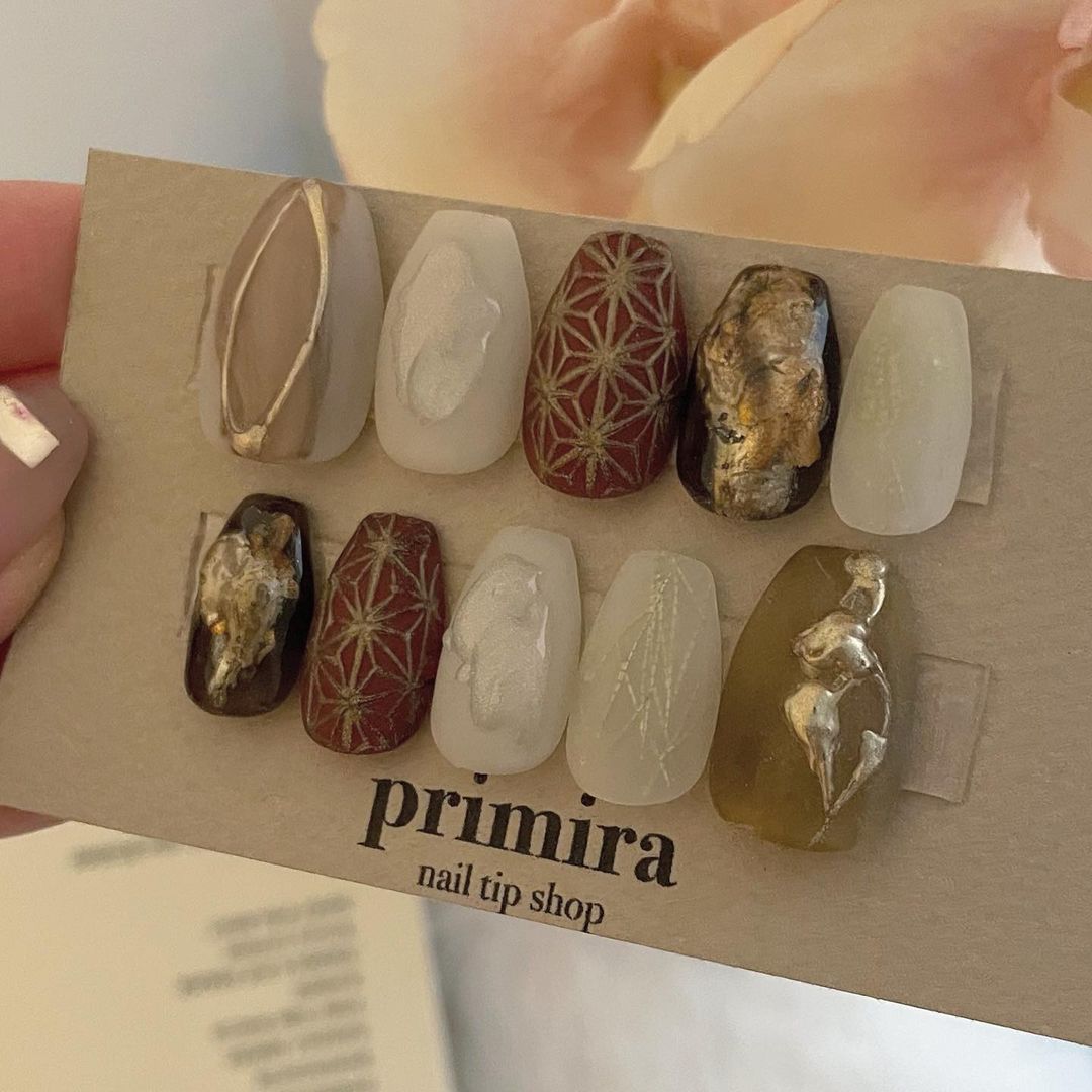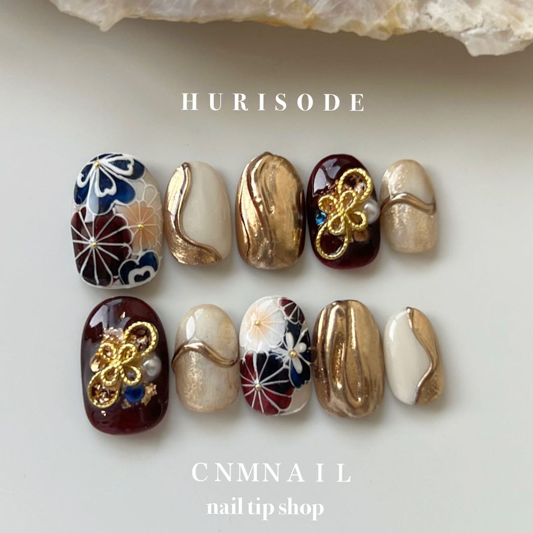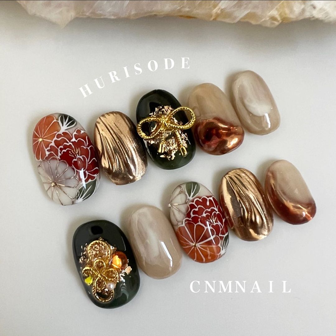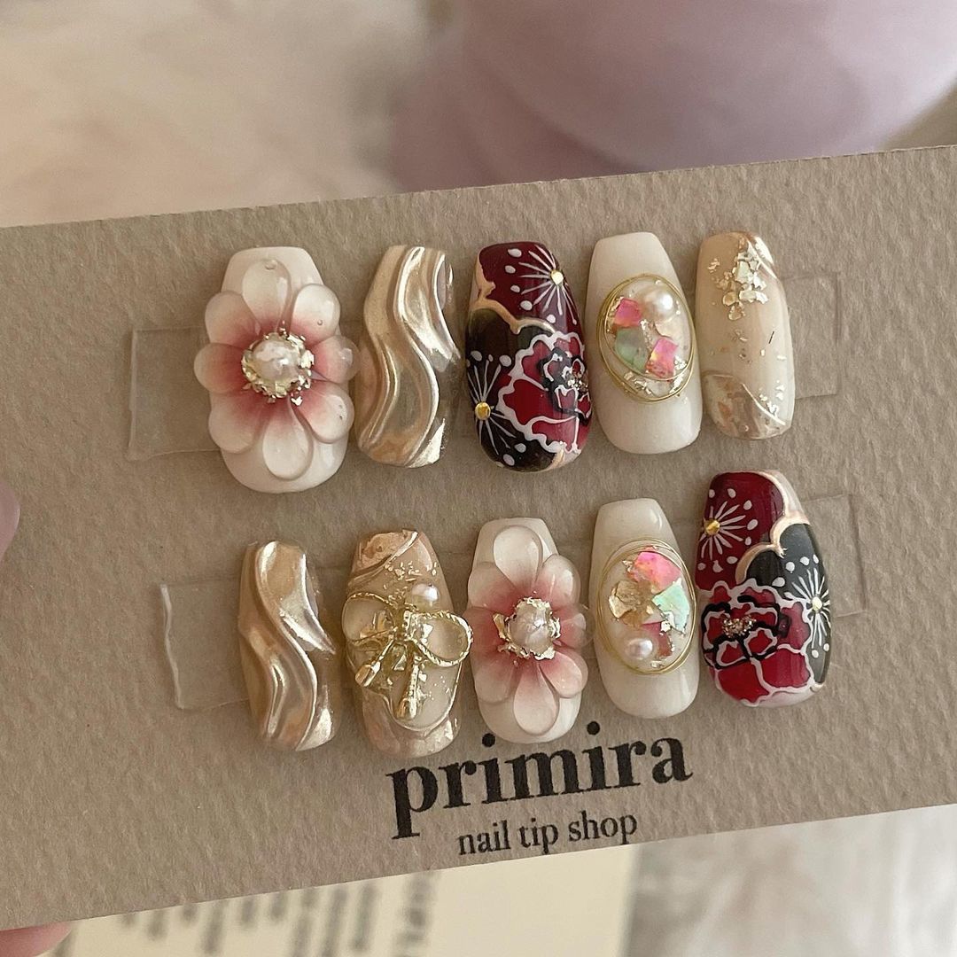 ぷっくりフラワーの綺麗めデザインからパーツを使った派手めのデザインまで、赤系の和柄ネイルを集めましたので、ぜひ参考にしてくださいね💅🏻